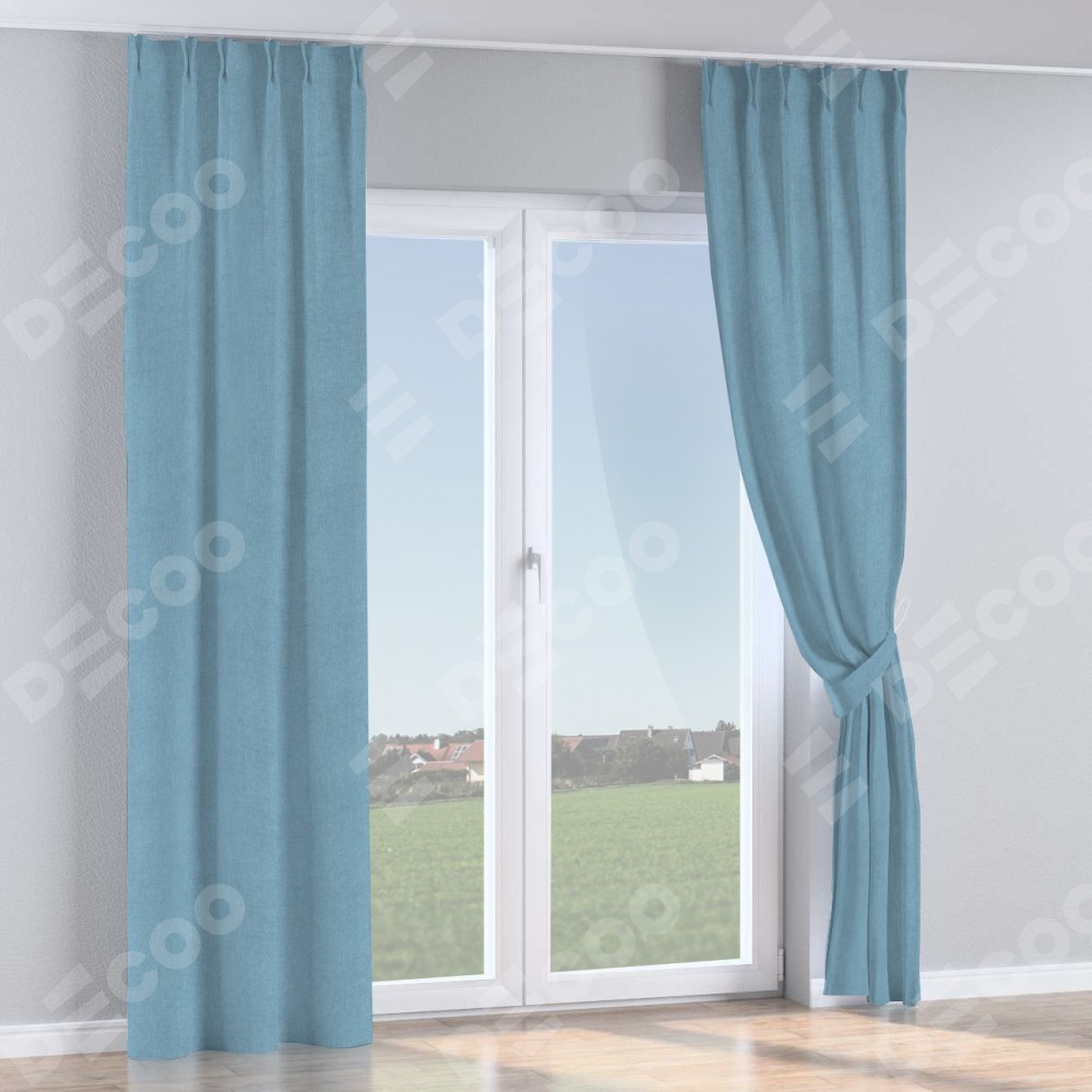 Комплект прямых штор, от производителя «Cortin», пошиты из ткани лён блэкаут голубой, артикул ткани 69574. С изнаночной стороны в верхней части штор пристрачивается шторная лента с декоративными складками «Кустик». Для создания элегантных складок прямые шторы шьются по стандарту с коэффициентом 1:2 (на 100 см. ширины проёма 200 см. ширины ткани).