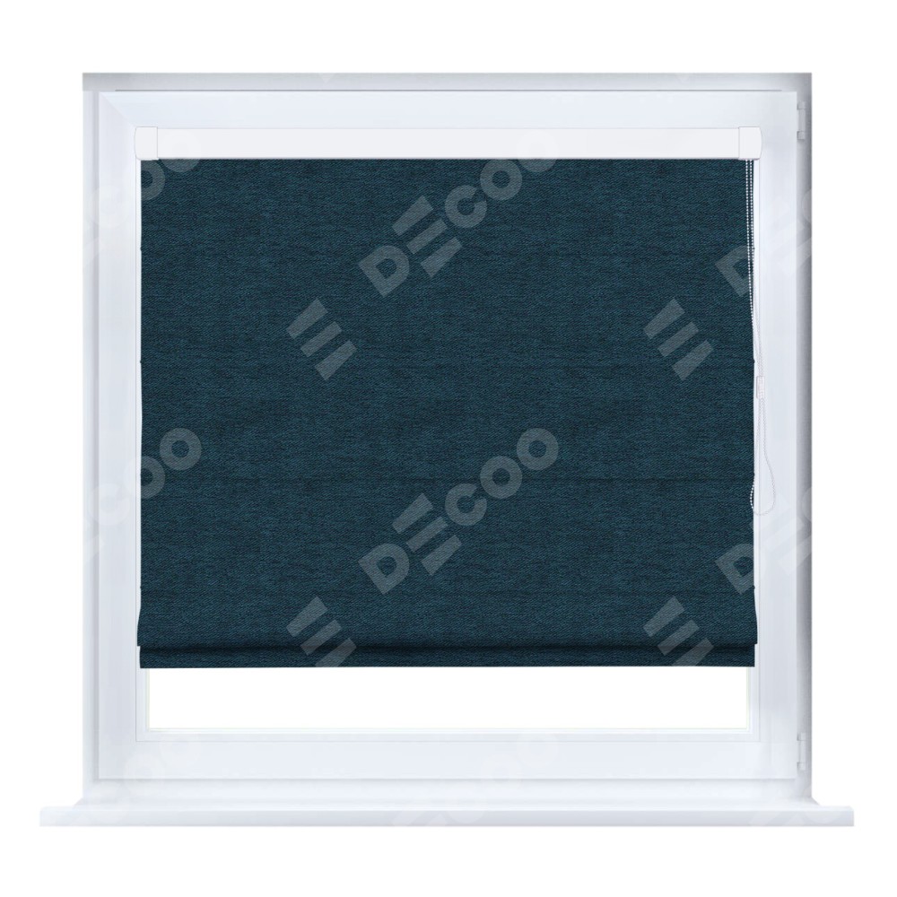Римская штора кассетного типа, производителя «Cortin», устанавливается только на пластиковые окна и прилегает к стеклопакету, пошита из ткани твид блэкаут глубокий синий, артикул 21590.