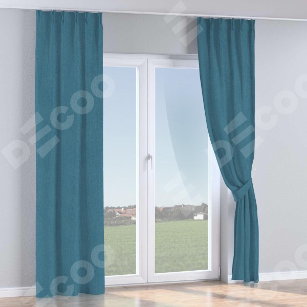 Комплект прямых штор, от производителя «Cortin», пошиты из ткани лён блэкаут синий, артикул ткани 69528. С изнаночной стороны в верхней части штор пристрачивается шторная лента с декоративными складками «Кустик». Для создания элегантных складок прямые шторы шьются по стандарту с коэффициентом 1:2 (на 100 см. ширины проёма 200 см. ширины ткани).