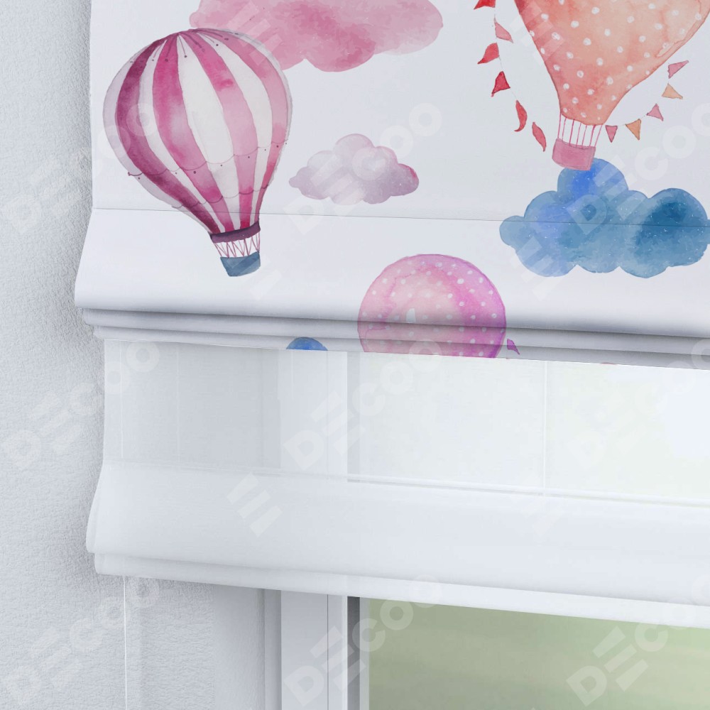 Римская штора день-ночь производителя «Cortin», используется для проёма, пошита из двух полотен, с лицевой блэкаут с нанесением сублимационной печати «Полёт в облаках», вторая ткань тюль (по стандарту комплектуется тюль белого цвета артикул V-01). Имеет универсальный механизм и подходит для монтажа: на потолок, на стену и в нишу.