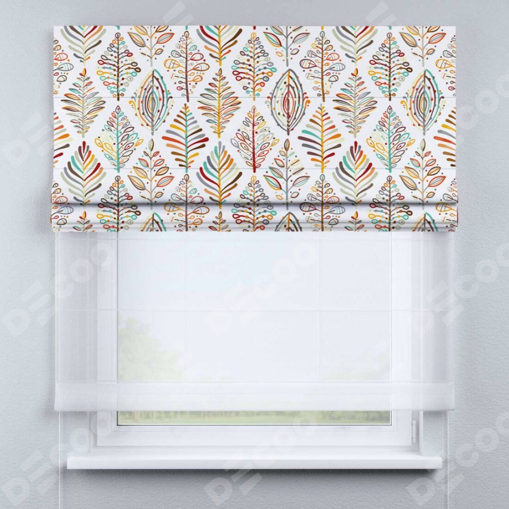 Римская штора день-ночь производителя «Cortin», используется для проёма, пошита из двух полотен, с лицевой блэкаут с нанесением сублимационной печати «Растительные ромбы», вторая ткань тюль (по стандарту комплектуется тюль белого цвета артикул V-01). Имеет универсальный механизм и подходит для монтажа: на потолок, на стену и в нишу.