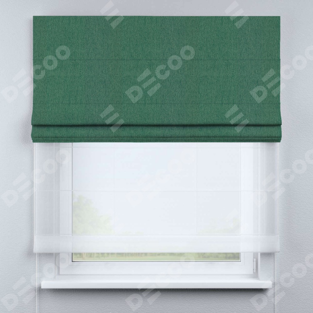 Римская штора день-ночь производителя «Cortin», используется для проёма, пошита из двух полотен, с лицевой стороны твид блэкаут зелёный артикул 21589, вторая ткань тюль (по стандарту комплектуется тюль белого цвета артикул V-01). Имеет универсальный механизм и подходит для монтажа: на потолок, на стену и в нишу.