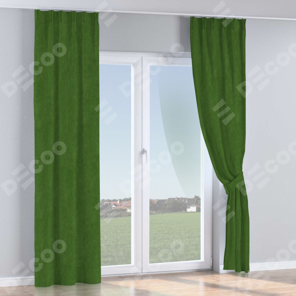 Комплект прямых штор, от производителя «Cortin», пошиты из ткани вельвет тёмно-салатовый, артикул ткани 33805. С изнаночной стороны в верхней части штор пристрачивается шторная лента с декоративными складками «Кустик». Для создания элегантных складок прямые шторы шьются по стандарту с коэффициентом 1:2 (на 100 см. ширины проёма 200 см. ширины ткани).