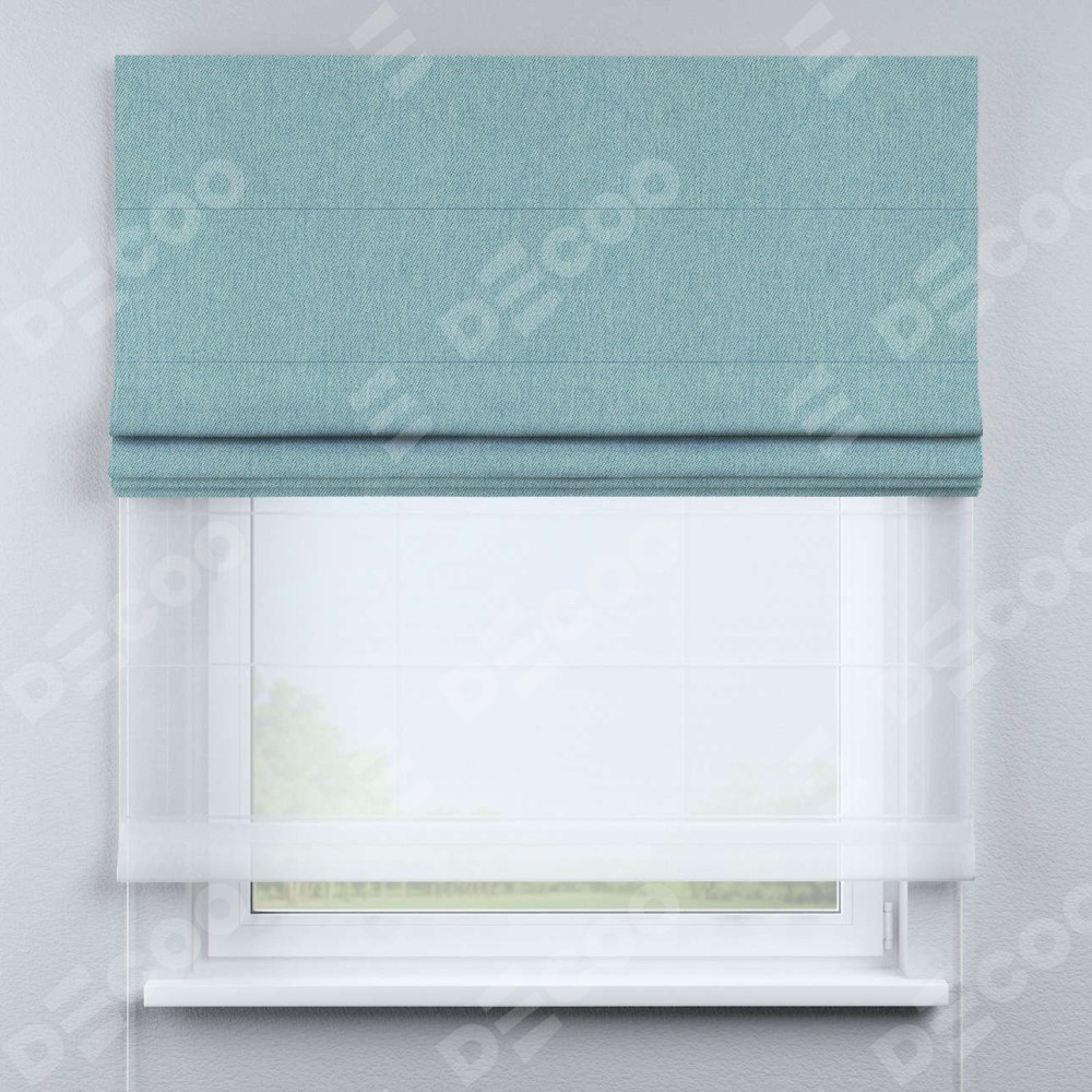 Римская штора день-ночь производителя «Cortin», используется для проёма, пошита из двух полотен, с лицевой стороны твид блэкаут небесно-голубой артикул 21578, вторая ткань тюль (по стандарту комплектуется тюль белого цвета артикул V-01). Имеет универсальный механизм и подходит для монтажа: на потолок, на стену и в нишу.
