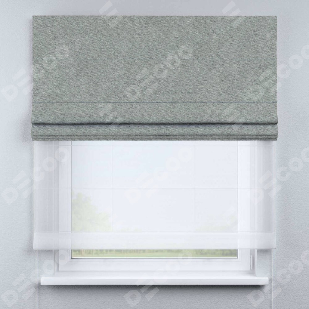 Римская штора день-ночь производителя «Cortin», используется для проёма, пошита из двух полотен, с лицевой стороны твид блэкаут светло-серый артикул 21576, вторая ткань тюль (по стандарту комплектуется тюль белого цвета артикул V-01). Имеет универсальный механизм и подходит для монтажа: на потолок, на стену и в нишу.