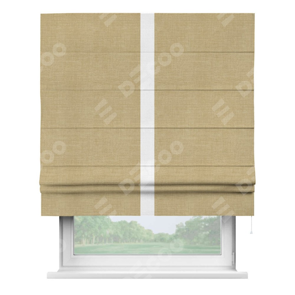 Римская штора производителя «Cortin», используется для проёма, пошита из ткани лён бежевый, артикул 7442. Отделка шторы кантом «Хайвэй», ткань для канта используется из льна разной расцветки на выбор. Имеет универсальный механизм и подходит для монтажа: на потолок, на стену и в нишу.