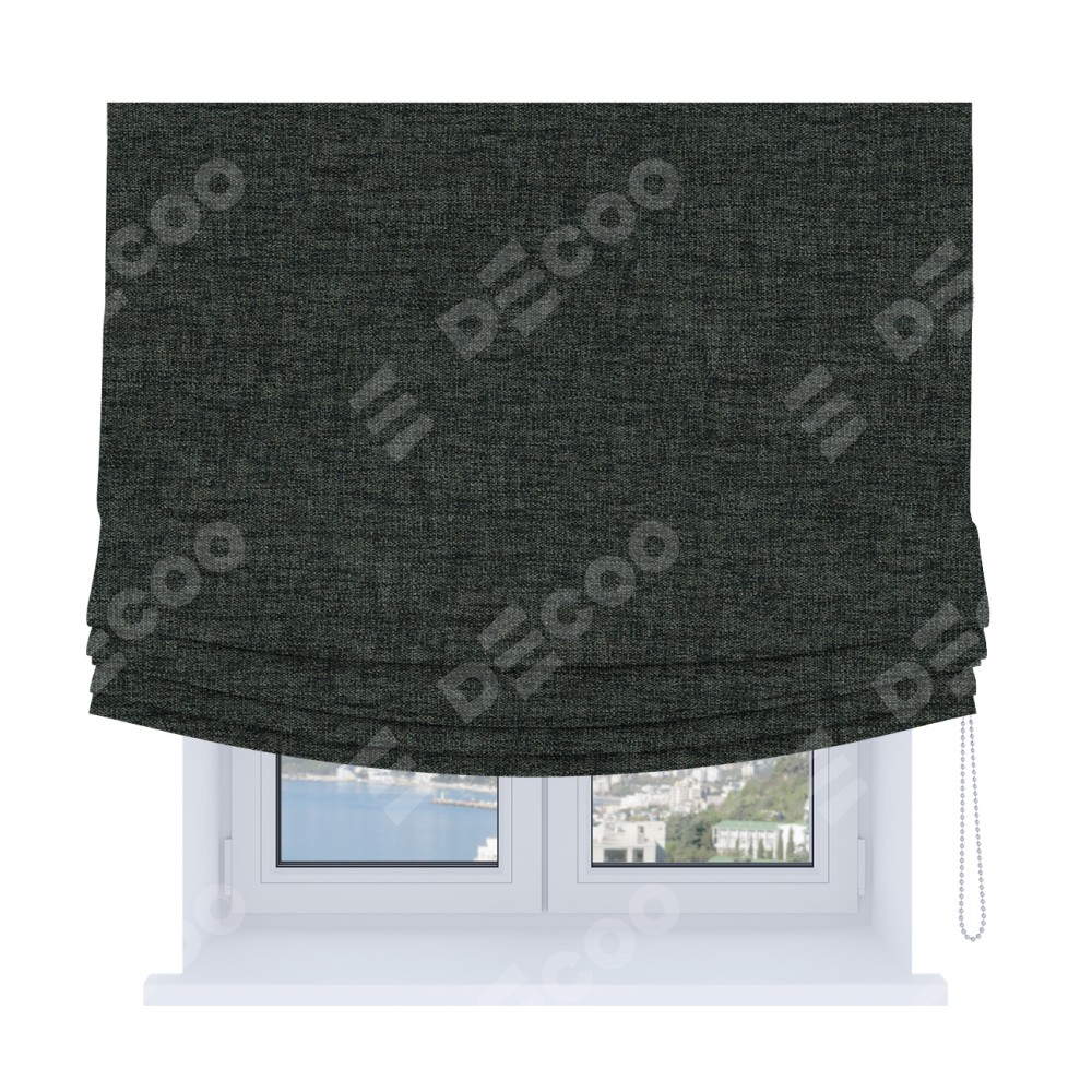 Римская штора Soft производителя «Cortin», используется для проёма, пошита из ткани рогожка димаут графит, артикул ткани 102−34. Имеет универсальный механизм и подходит для монтажа: на потолок, на стену и в нишу. В отличие от стандартных римских штор, римская штора Soft не имеет горизонтальных вставок и нижнего отвеса. Это позволяет ткани произвольно драпироваться в свободные мягкие складки.