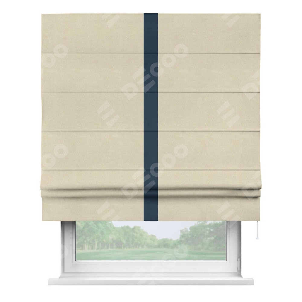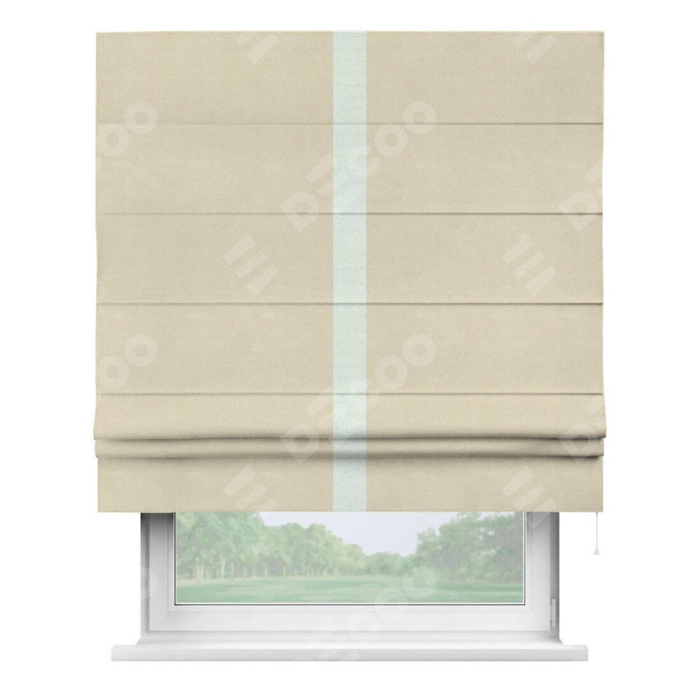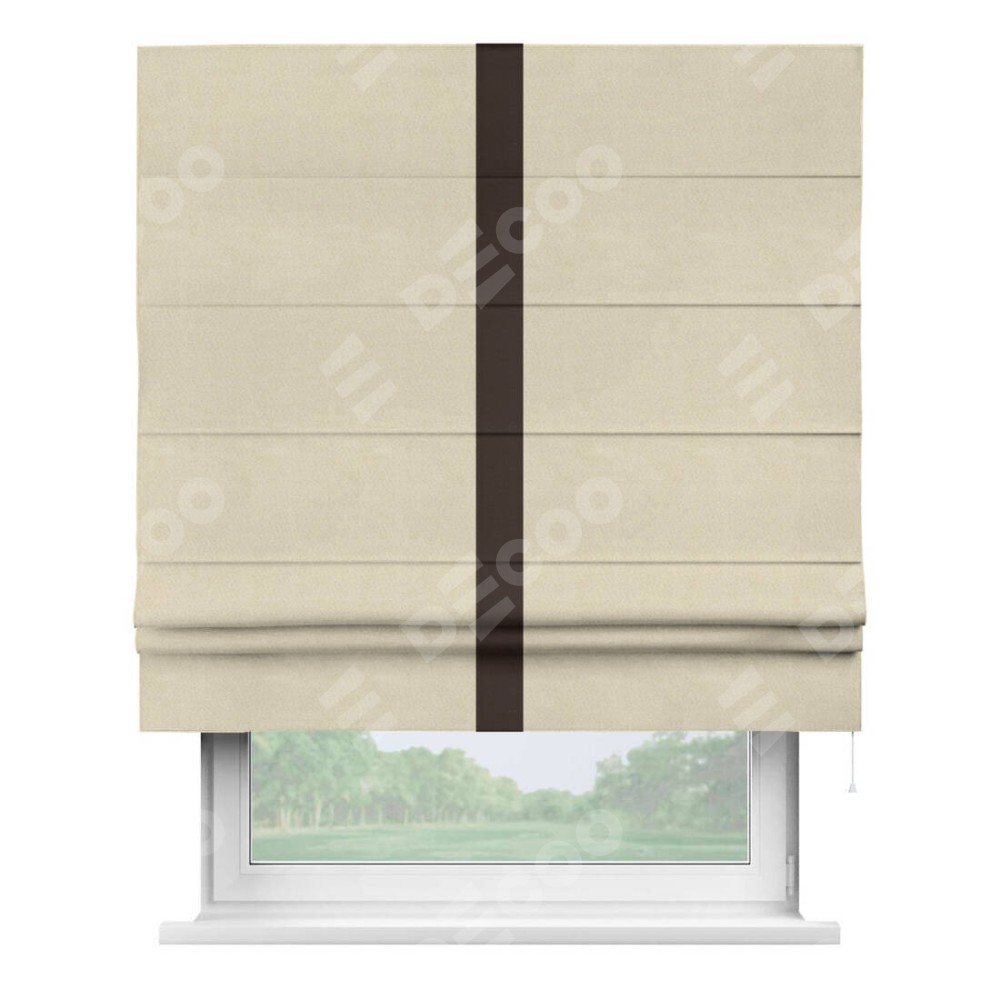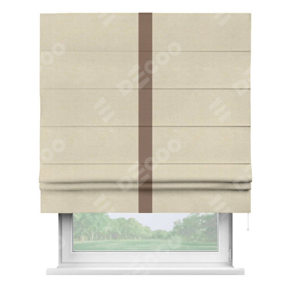 Римская штора производителя «Cortin», используется для проёма, пошита из ткани блэкаут однотонный бежевый, артикул ткани 13125. Отделка шторы кантом «Хайвей», ткань для канта используется из блэкаута однотонного разной расцветки на выбор. Имеет универсальный механизм и подходит для монтажа: на потолок, на стену и в нишу.