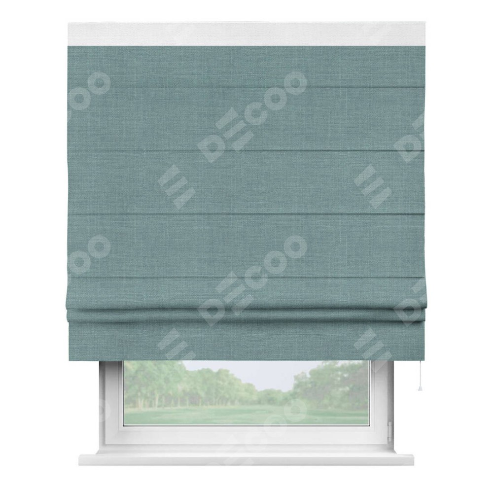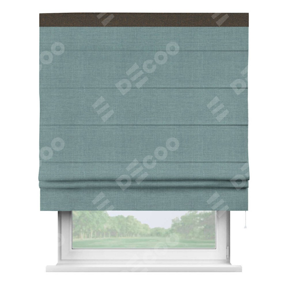 Римская штора производителя «Cortin», используется для проёма, пошита из ткани лён голубой, артикул 74 736. Отделка шторы кантом «Кинг», ткань для канта используется из льна разной расцветки на выбор. Имеет универсальный механизм и подходит для монтажа: на потолок, на стену и в нишу.