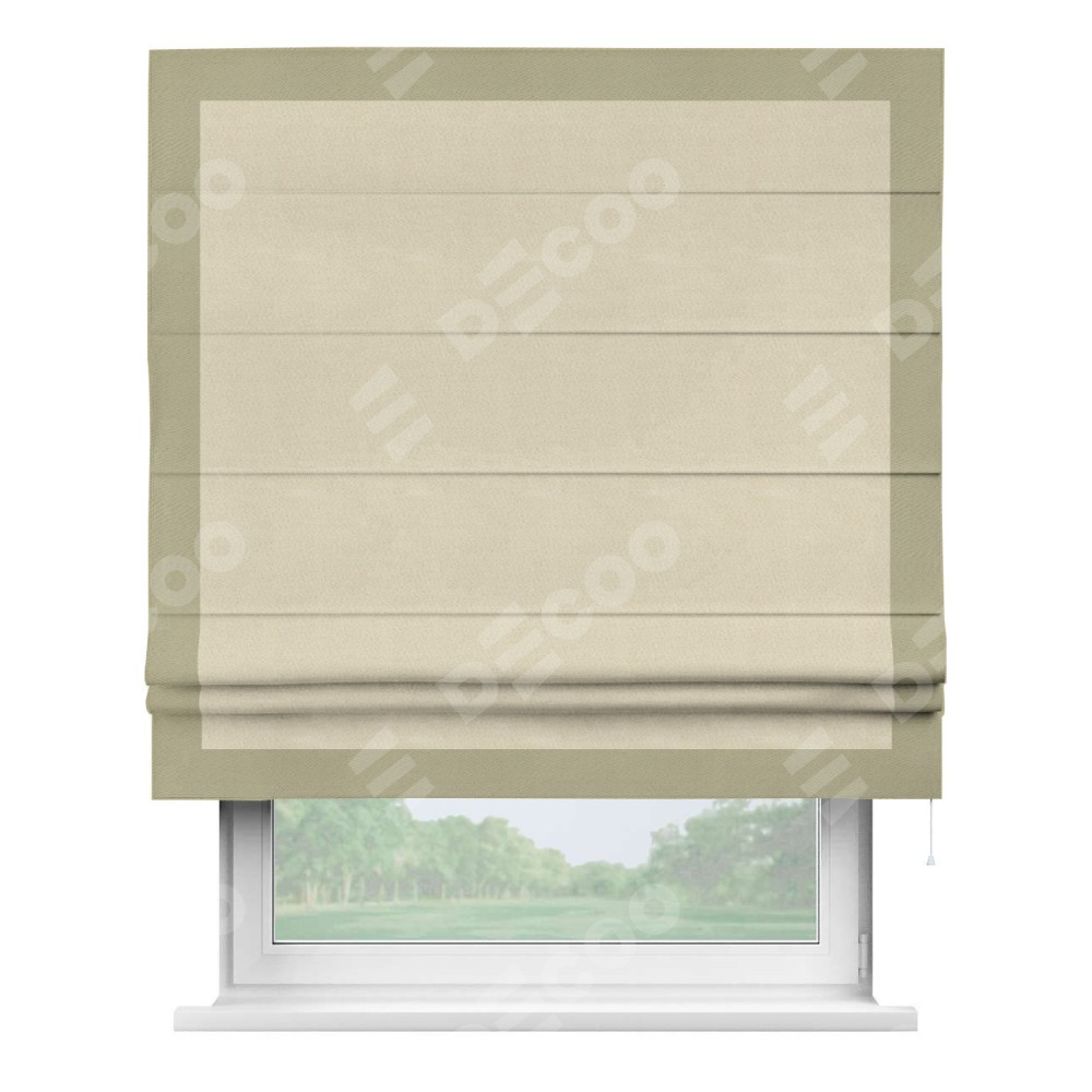 Римская штора производителя «Cortin», используется для проёма, пошита из ткани блэкаут однотонный бежевый, артикул ткани 13125. Отделка шторы кантом «Чесс», ткань для канта используется из блэкаута однотонного разной расцветки на выбор. Имеет универсальный механизм и подходит для монтажа: на потолок, на стену и в нишу.