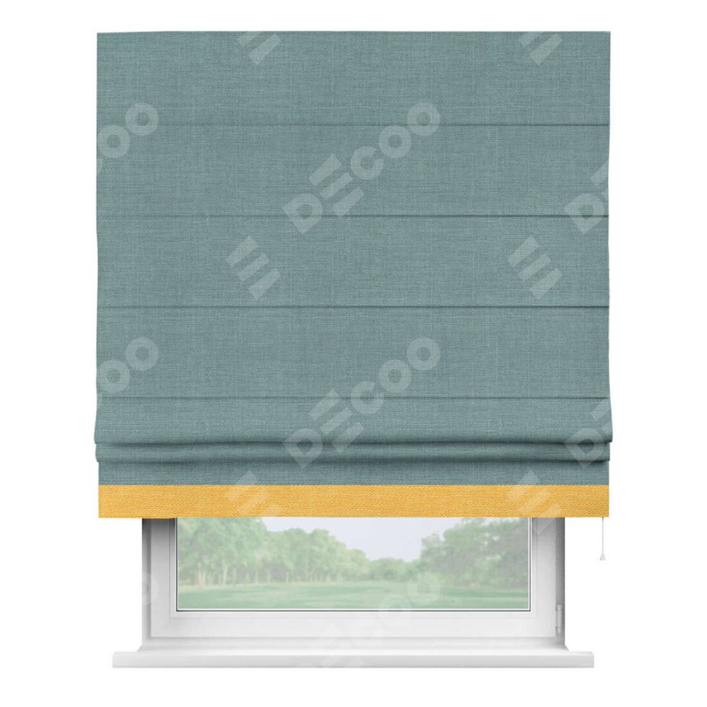 Римская штора производителя «Cortin», используется для проёма, пошита из ткани лён голубой, артикул 74736. Отделка шторы кантом «Джестер», ткань для канта используется из льна разной расцветки на выбор. Имеет универсальный механизм и подходит для монтажа: на потолок, на стену и в нишу.