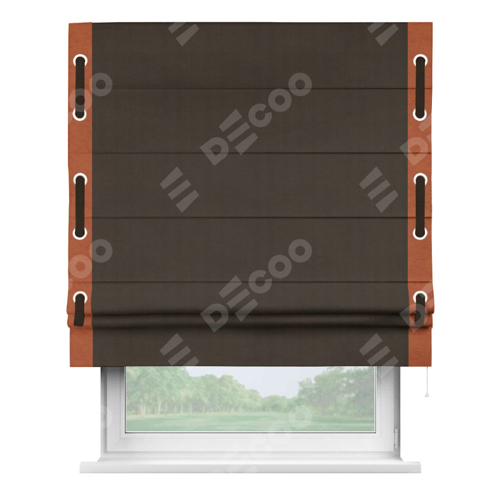 Римская штора производителя «Cortin», используется для проёма, пошита из ткани вельвет тёмно-коричневый, артикул ткани 30991. Отделка шторы кантом «Стрим Дуо» на кантах расположены люверсы с пояском, ткань для канта используется из вельвета разной расцветки на выбор. Ткань для пояска обычно используется из основной ткани шторы, а так же можно сделать из любой расцветки по желанию. Имеет универсальный механизм и подходит для монтажа: на потолок, на стену и в нишу.