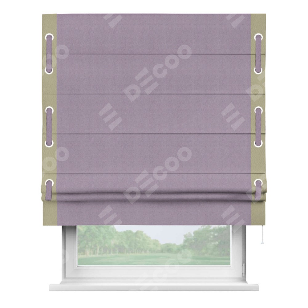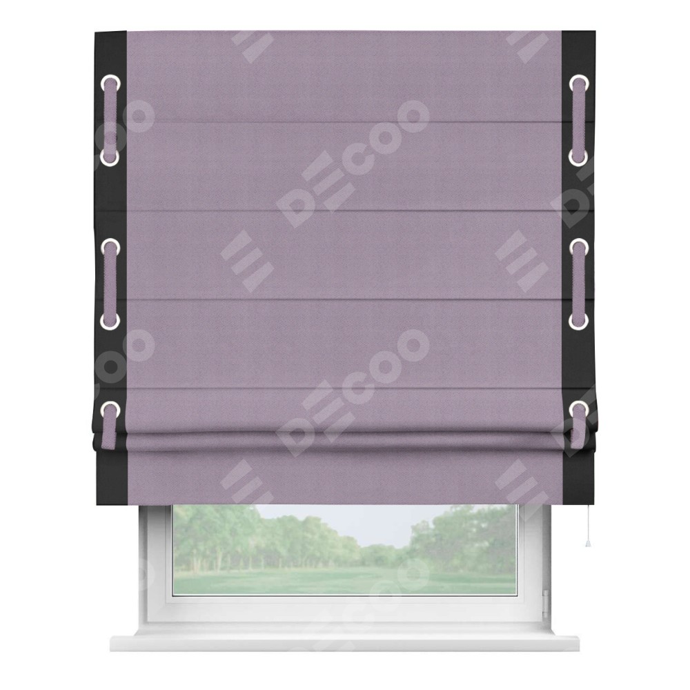 Римская штора производителя «Cortin», используется для проёма, пошита из ткани блэкаут однотонный светло-сиреневый, артикул ткани 29333−1. Отделка шторы кантом «Стрим Дуо» на кантах расположены люверсы с пояском, ткань для канта используется из блэкаута однотонного разной расцветки на выбор. Ткань для пояска обычно используется из основной ткани шторы, а так же можно сделать из любой расцветки по желанию. Имеет универсальный механизм и подходит для монтажа: на потолок, на стену и в нишу.