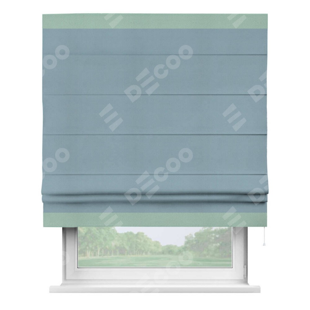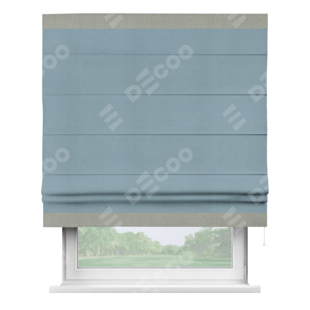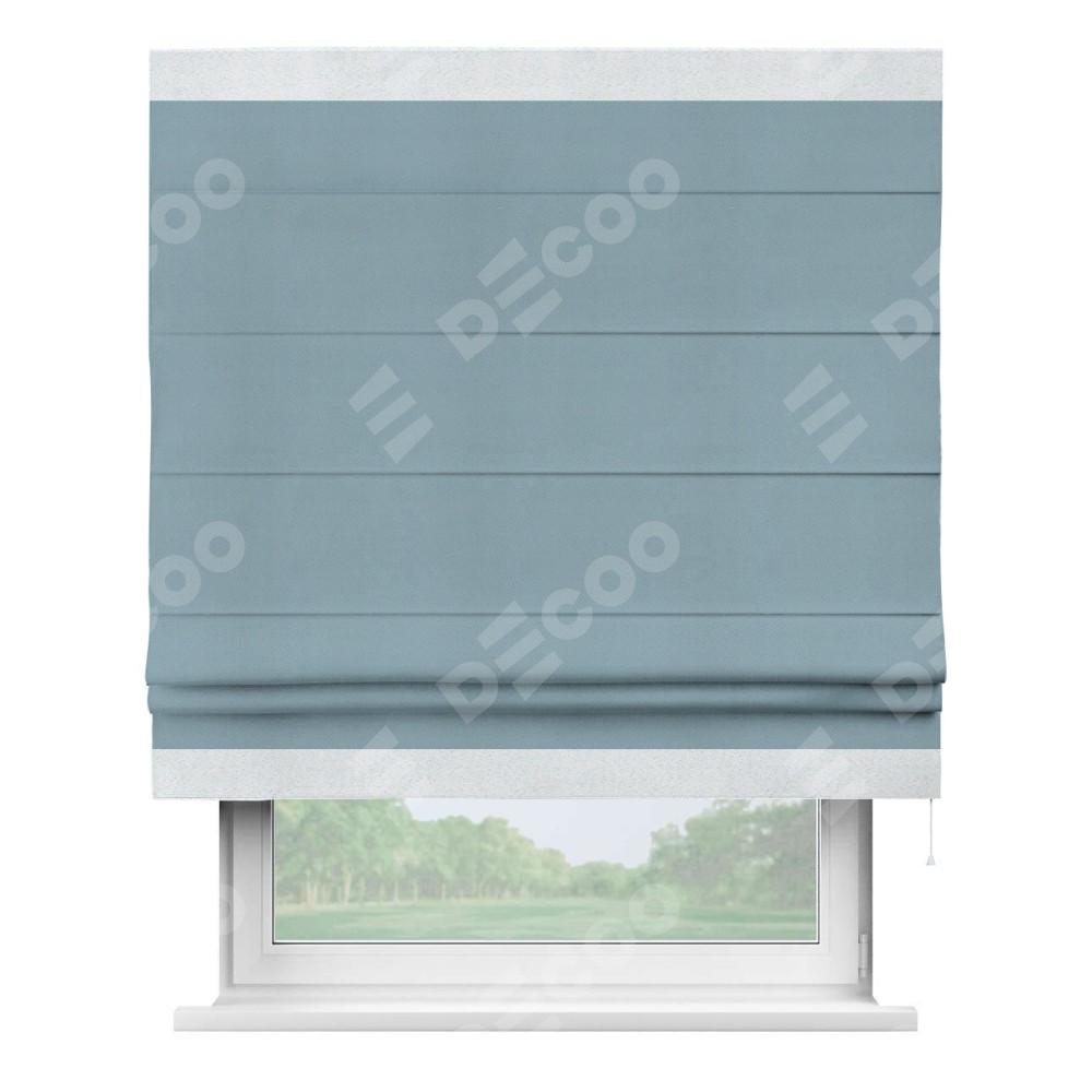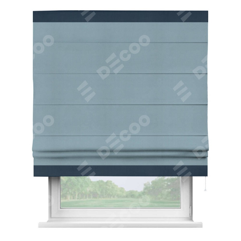 Римская штора производителя «Cortin», используется для проёма, пошита из ткани блэкаут однотонный серо-голубой, артикул ткани 29327−2. Отделка шторы кантом «Горизонт», ткань для канта используется из блэкаута однотонного разной расцветки на выбор. Имеет универсальный механизм и подходит для монтажа: на потолок, на стену и в нишу.