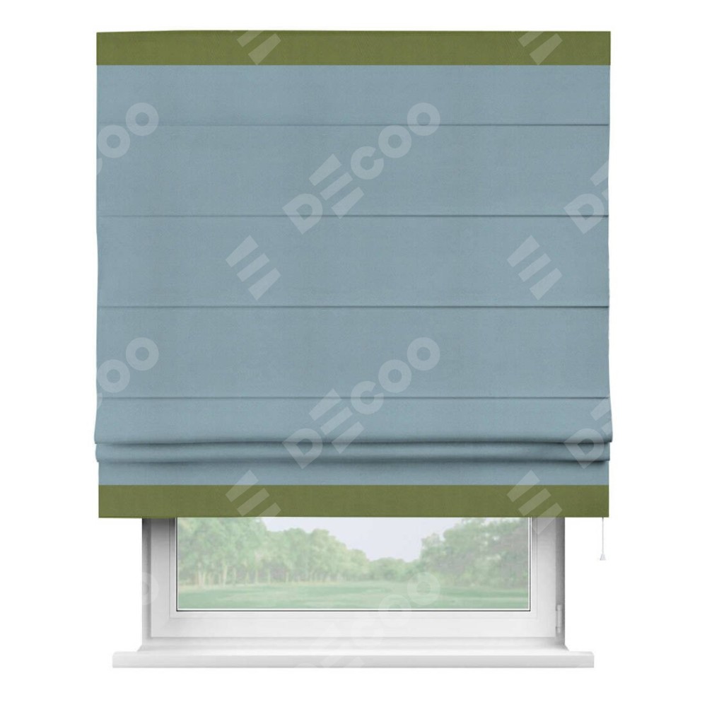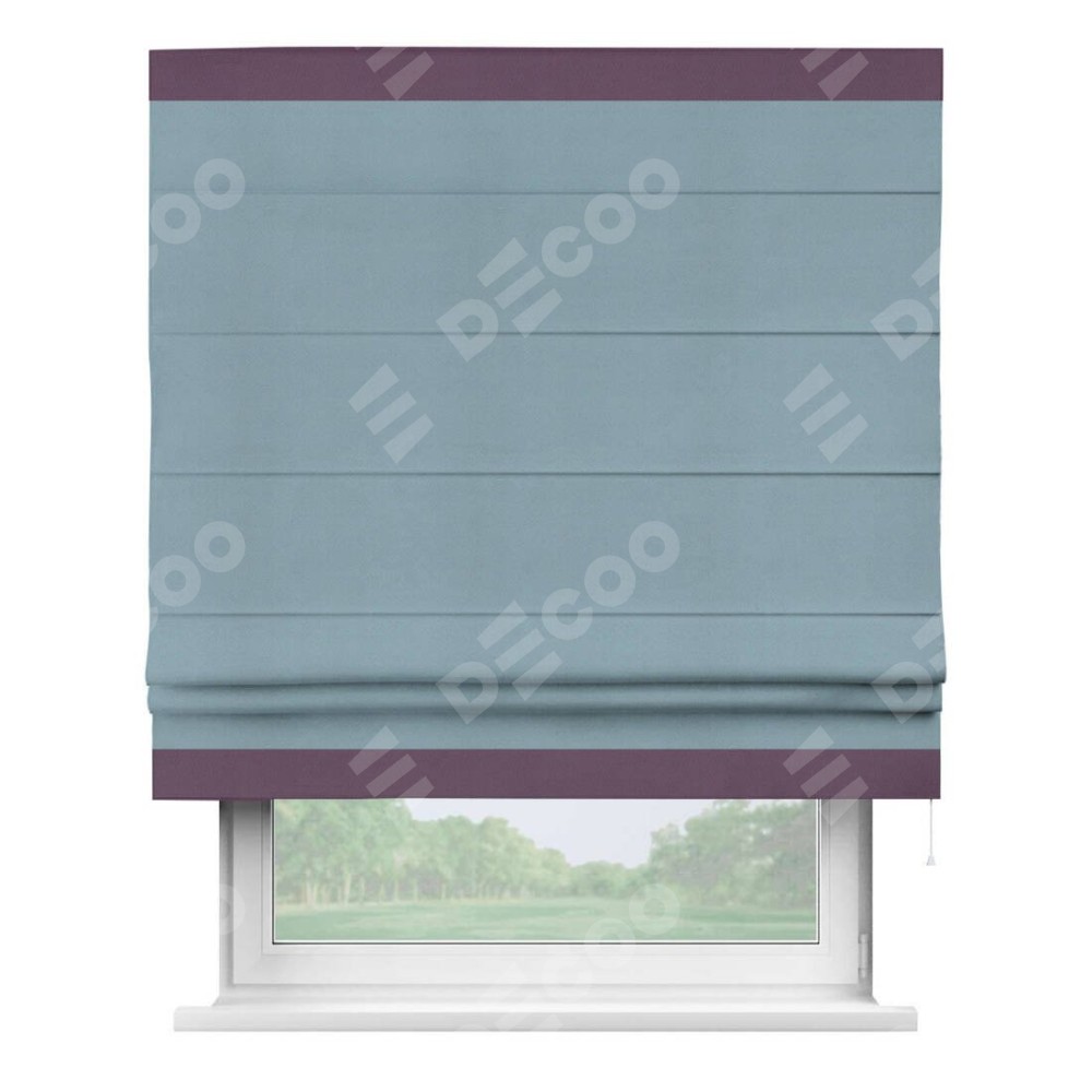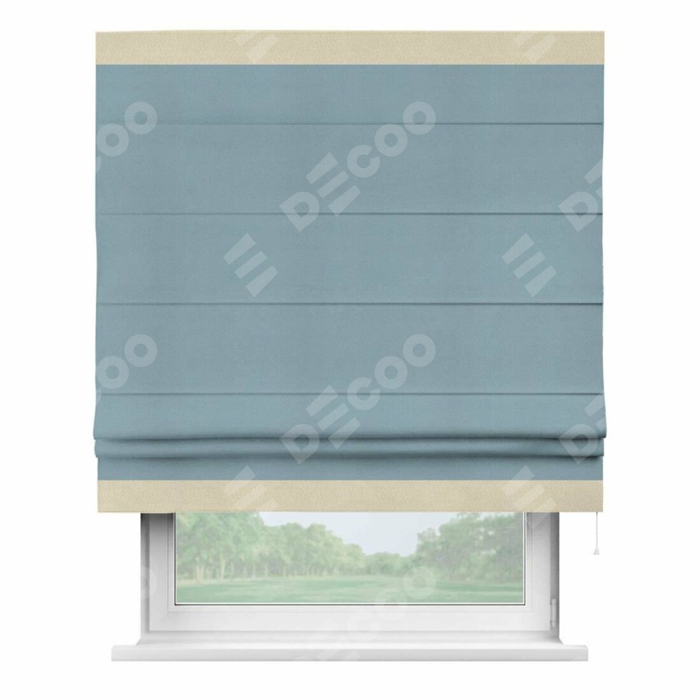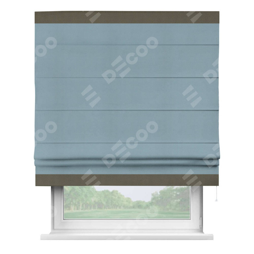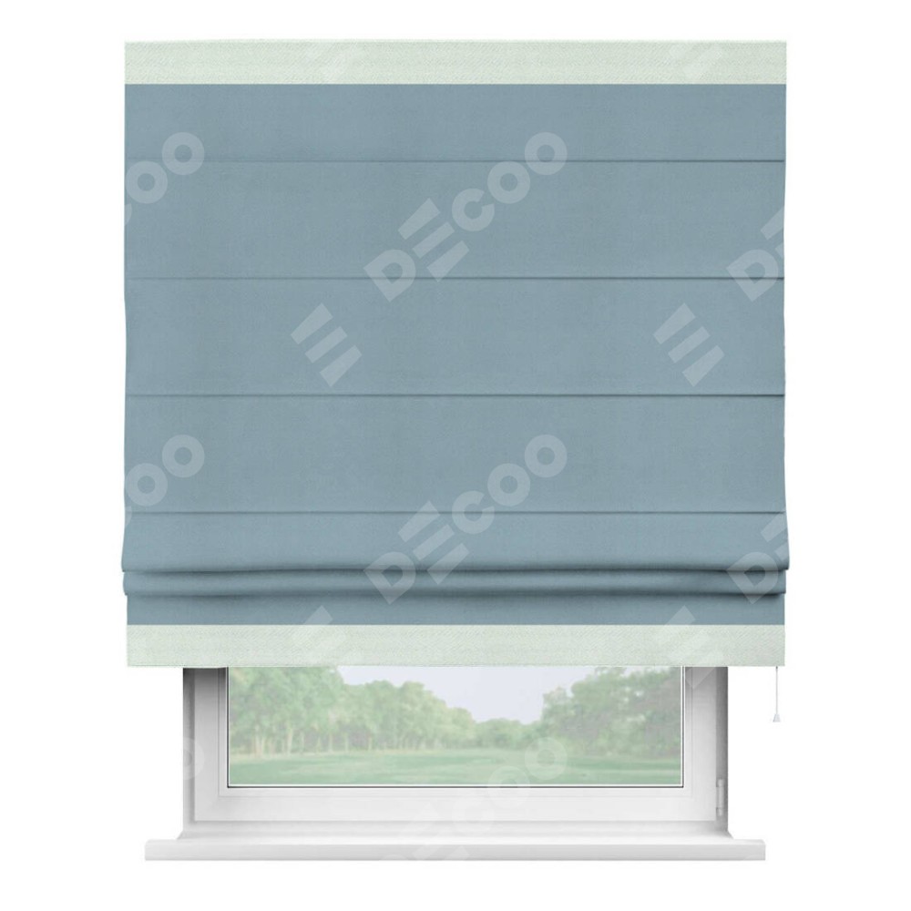 Римская штора производителя «Cortin», используется для проёма, пошита из ткани блэкаут однотонный серо-голубой, артикул ткани 29327−2. Отделка шторы кантом «Горизонт», ткань для канта используется из блэкаута однотонного разной расцветки на выбор. Имеет универсальный механизм и подходит для монтажа: на потолок, на стену и в нишу.