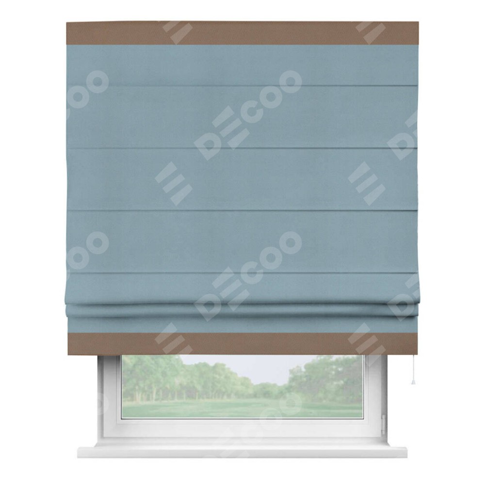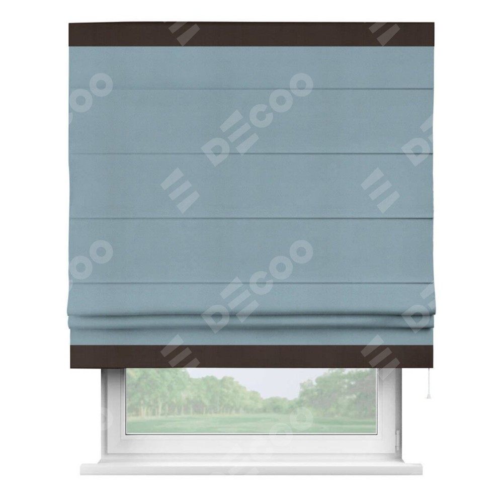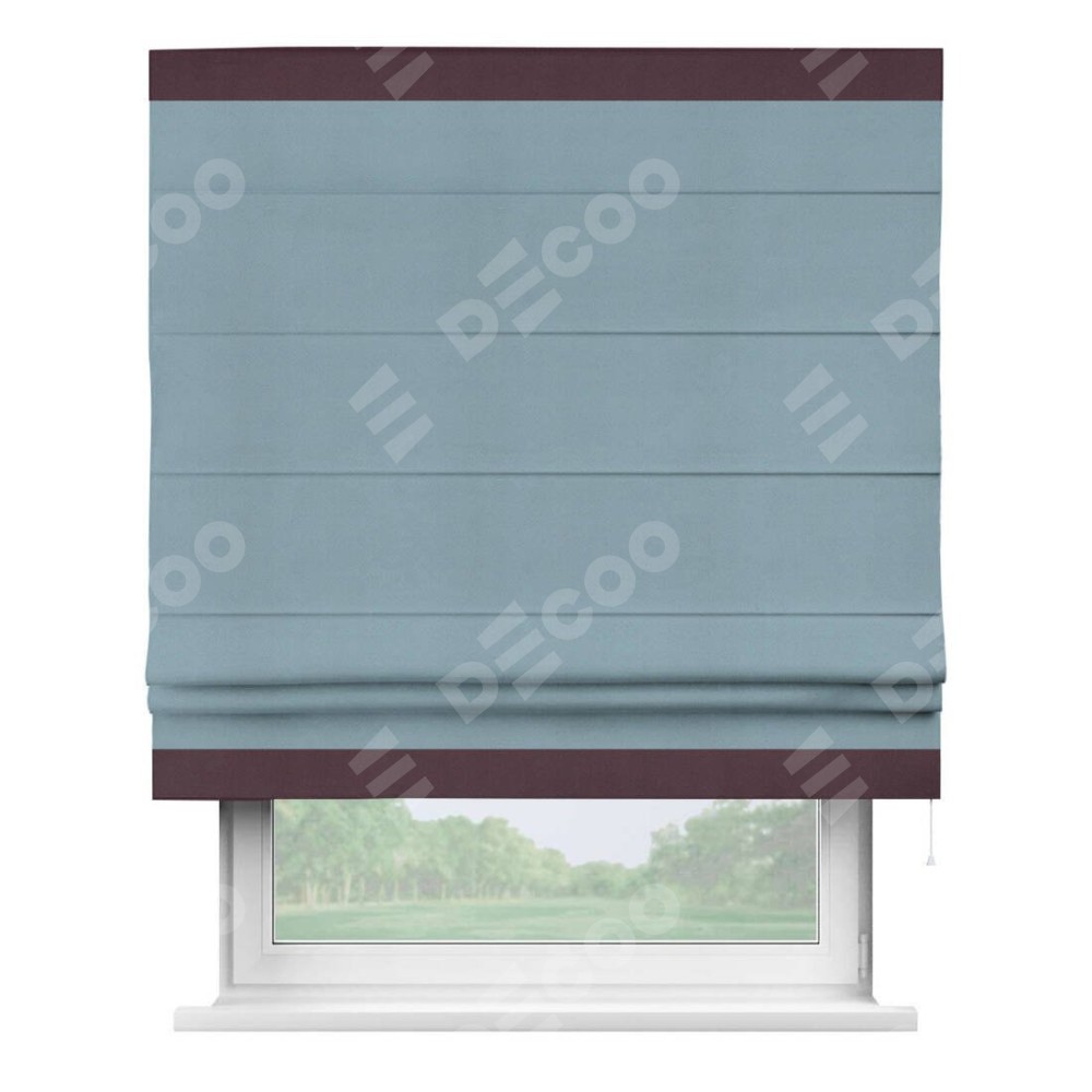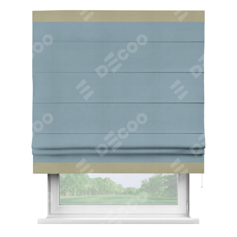 Римская штора производителя «Cortin», используется для проёма, пошита из ткани блэкаут однотонный серо-голубой, артикул ткани 29327−2. Отделка шторы кантом «Горизонт», ткань для канта используется из блэкаута однотонного разной расцветки на выбор. Имеет универсальный механизм и подходит для монтажа: на потолок, на стену и в нишу.