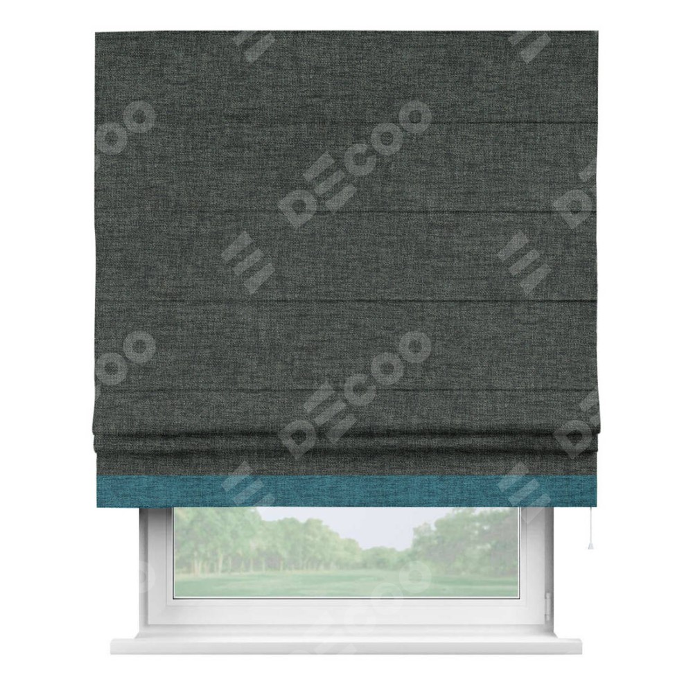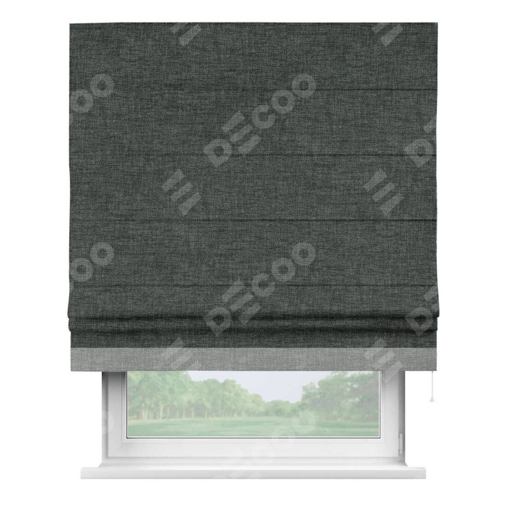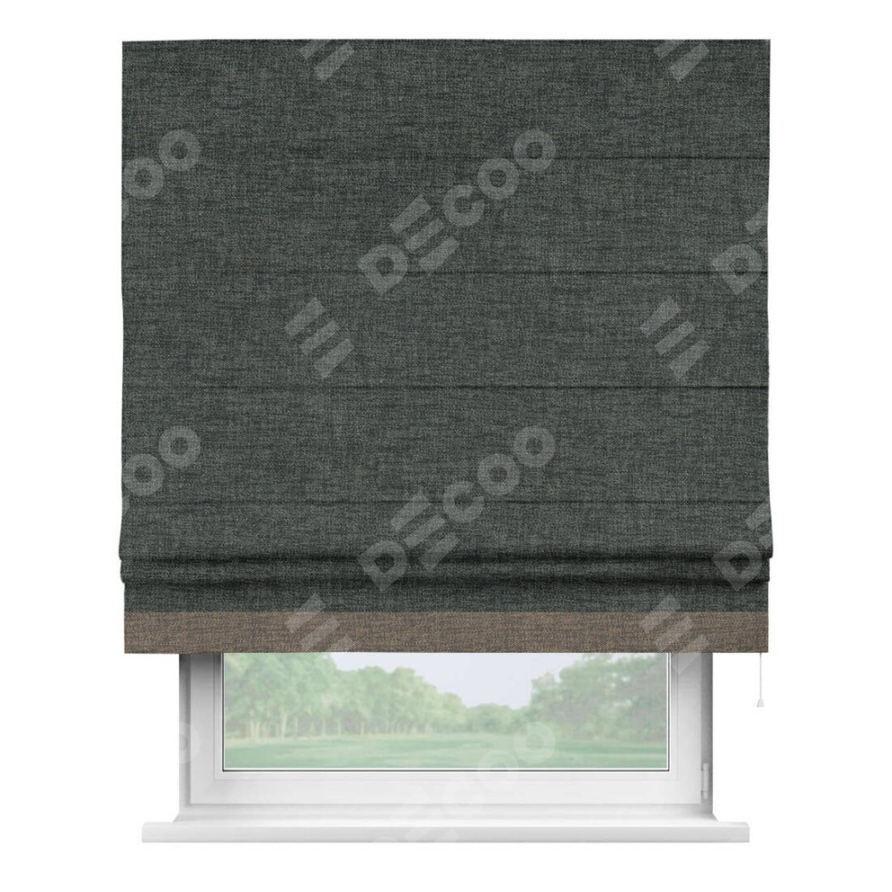 Римская штора производителя «Cortin», используется для проёма, пошита из ткани рогожка димаут графит, артикул 102−34. Отделка шторы кантом «Джестер», ткань для канта используется из рогожки димаут разной расцветки на выбор. Имеет универсальный механизм и подходит для монтажа: на потолок, на стену и в нишу.