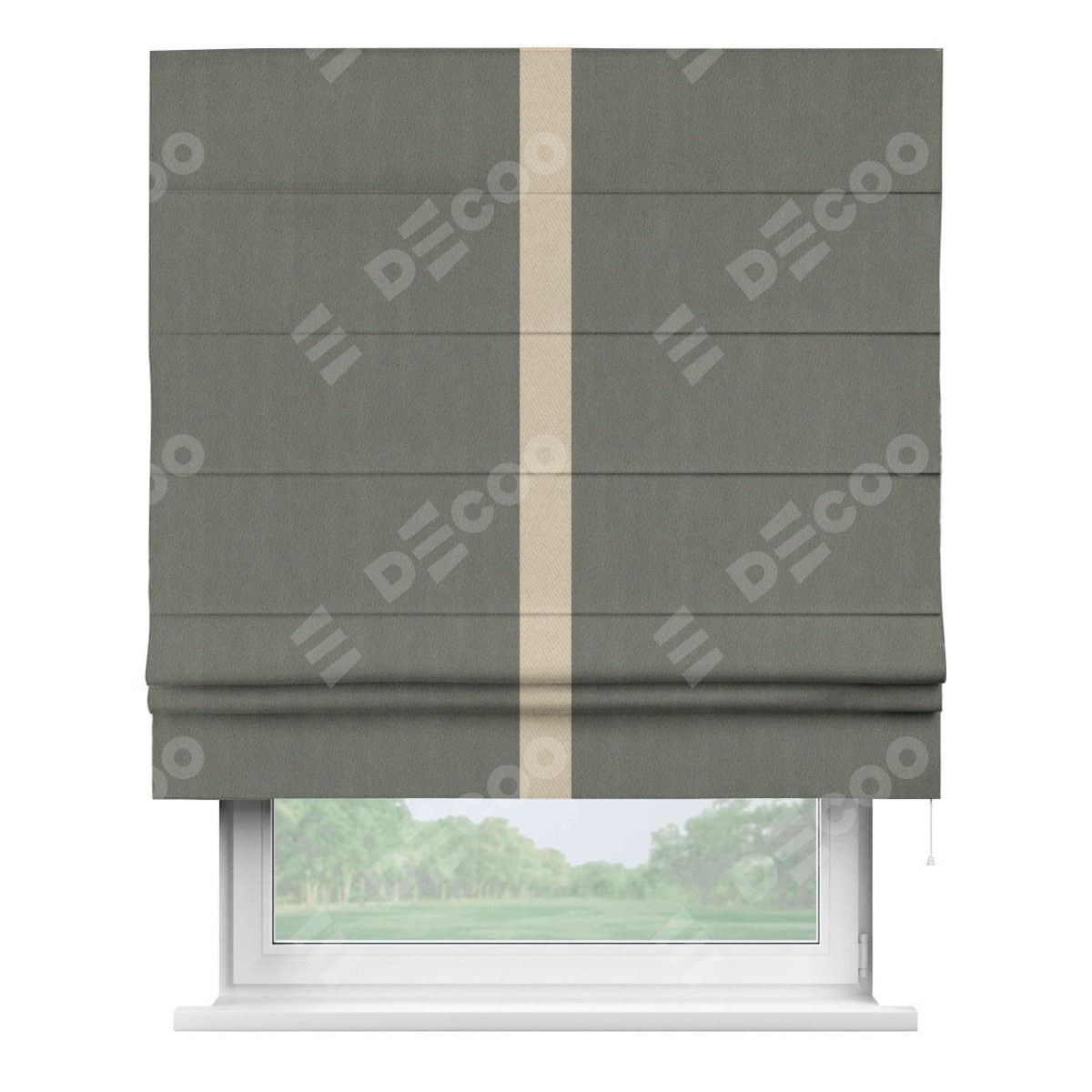Римская штора производителя «Cortin», используется для проёма, пошита из ткани блэкаут однотонный тёмно-серый, артикул ткани 29332−1. Отделка шторы кантом «Хайвей», ткань для канта используется из блэкаута однотонного разной расцветки на выбор. Имеет универсальный механизм и подходит для монтажа: на потолок, на стену и в нишу.