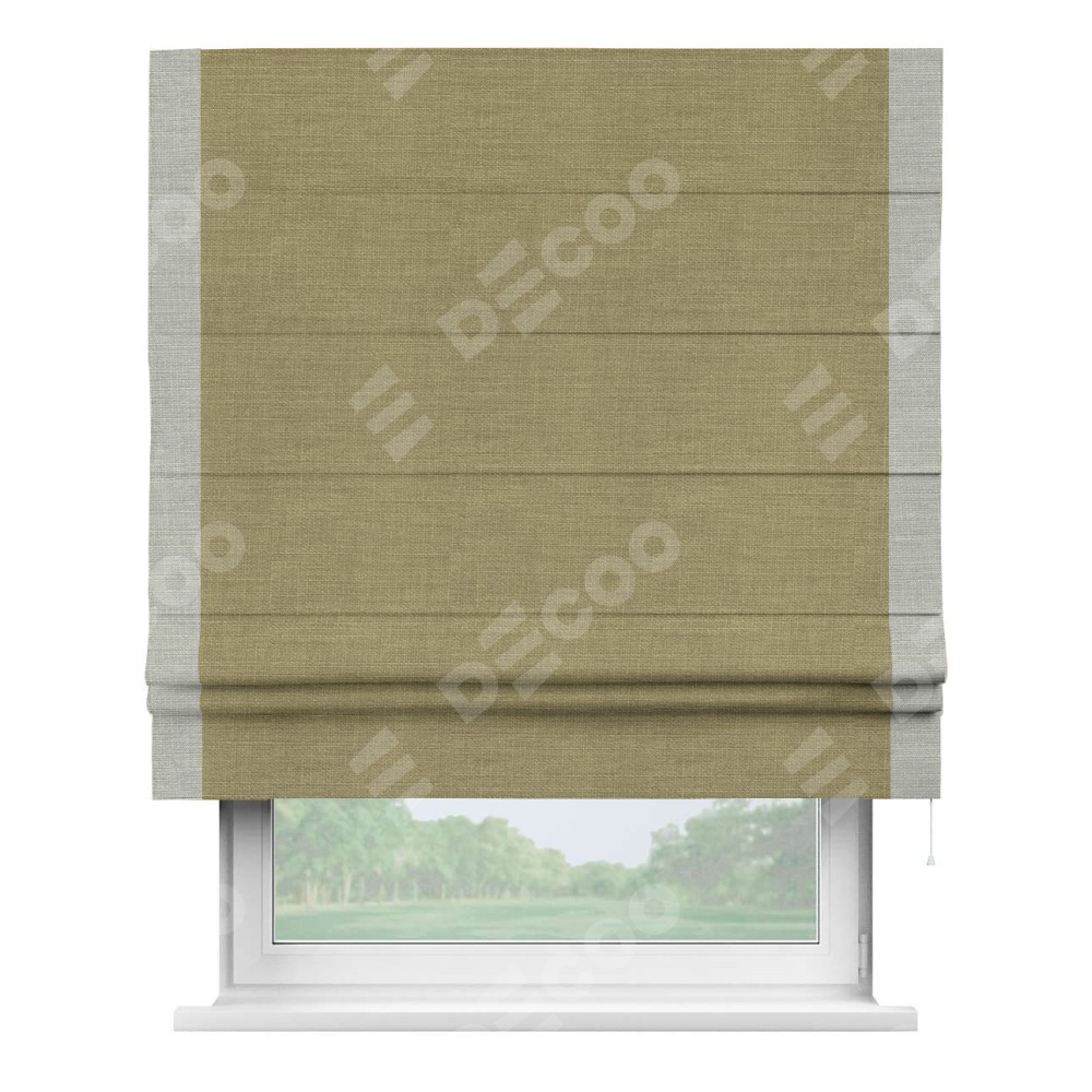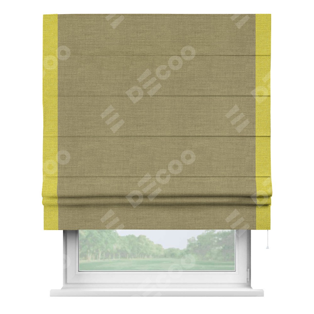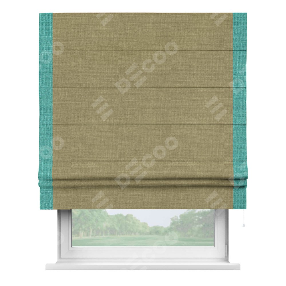 Римская штора производителя «Cortin», используется для проёма, пошита из ткани лён коричневый, артикул 7443. Отделка шторы кантом «Стрим Дуо», ткань для канта используется из льна разной расцветки на выбор. Имеет универсальный механизм и подходит для монтажа: на потолок, на стену и в нишу.