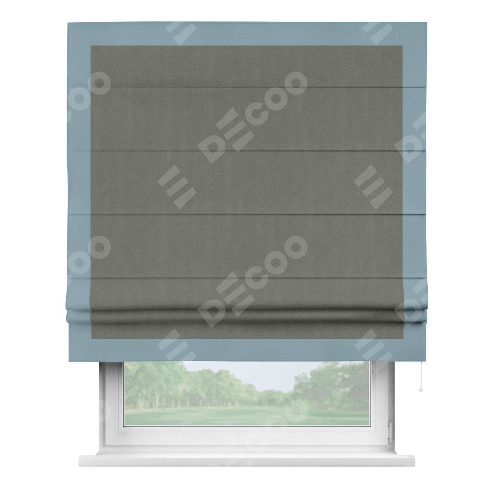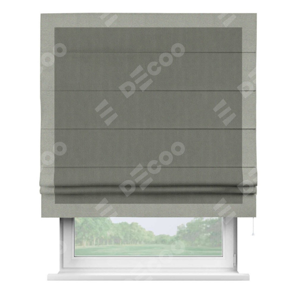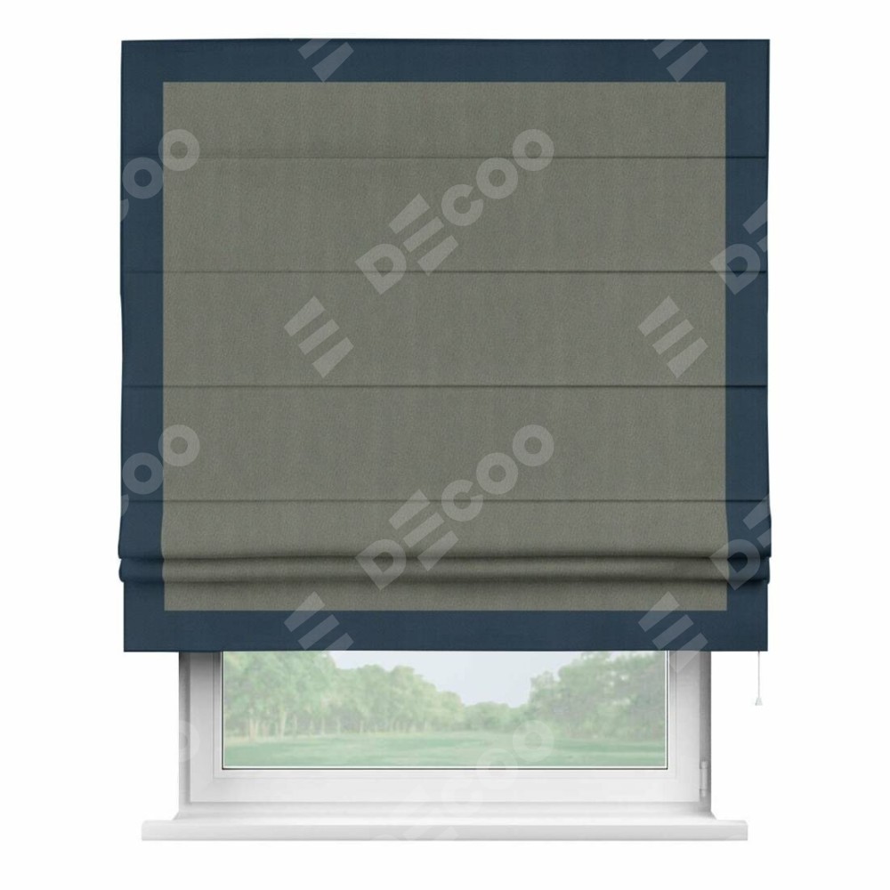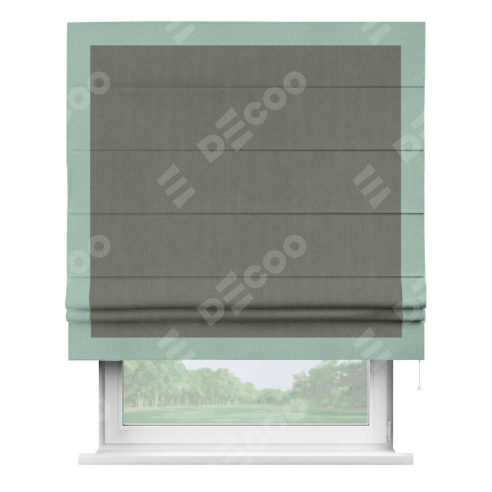 Римская штора производителя «Cortin», используется для проёма, пошита из ткани блэкаут однотонный тёмно-серый, артикул ткани 29332−1. Отделка шторы кантом «Чесс», ткань для канта используется из блэкаута однотонного разной расцветки на выбор. Имеет универсальный механизм и подходит для монтажа: на потолок, на стену и в нишу.