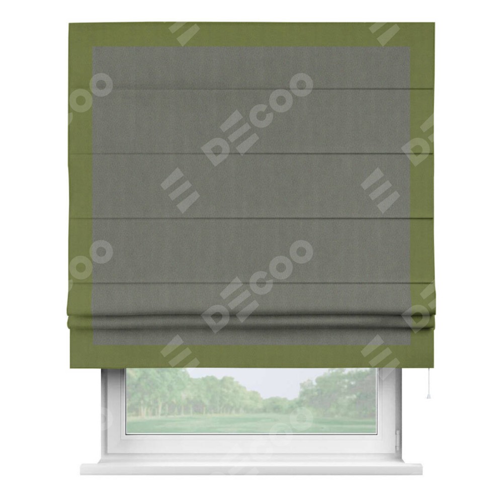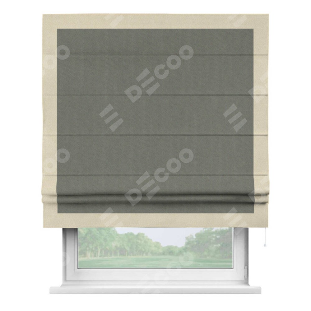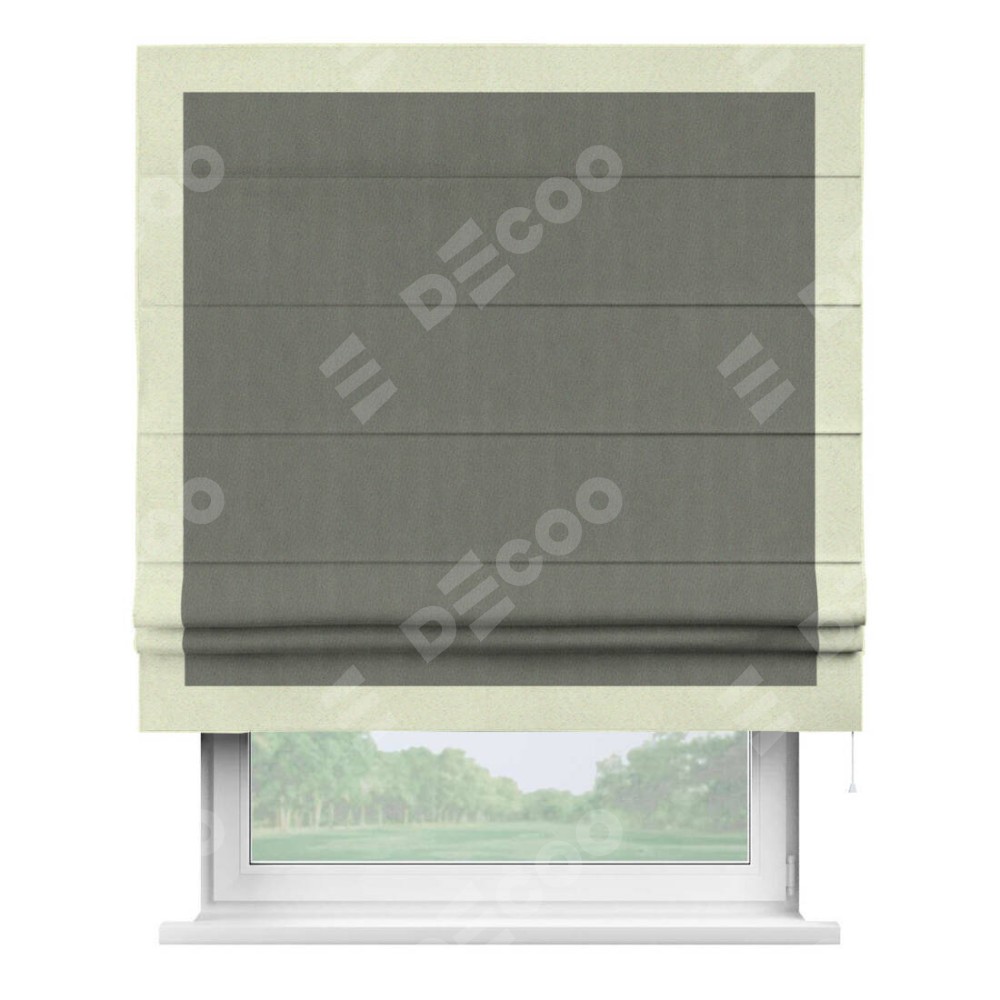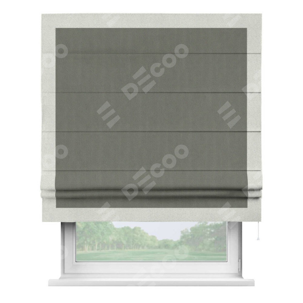 Римская штора производителя «Cortin», используется для проёма, пошита из ткани блэкаут однотонный тёмно-серый, артикул ткани 29332−1. Отделка шторы кантом «Чесс», ткань для канта используется из блэкаута однотонного разной расцветки на выбор. Имеет универсальный механизм и подходит для монтажа: на потолок, на стену и в нишу.