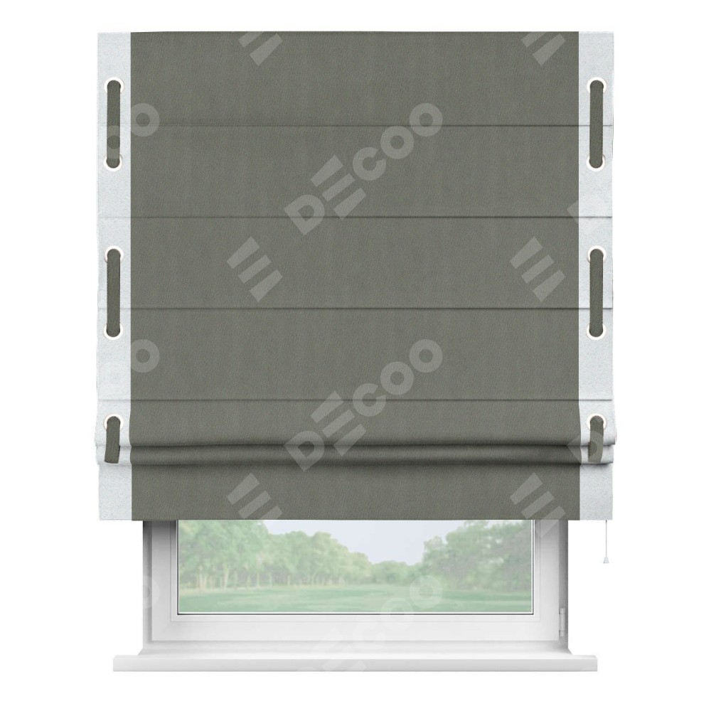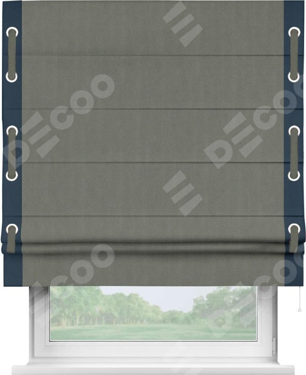 Римская штора производителя «Cortin», используется для проёма, пошита из ткани блэкаут однотонный тёмно-серый, артикул ткани 29332−1. Отделка шторы кантом «Стрим Дуо» на кантах расположены люверсы с пояском, ткань для канта используется из блэкаута однотонного разной расцветки на выбор. Ткань для пояска обычно используется из основной ткани шторы, а так же можно сделать из любой расцветки по желанию. Имеет универсальный механизм и подходит для монтажа: на потолок, на стену и в нишу.