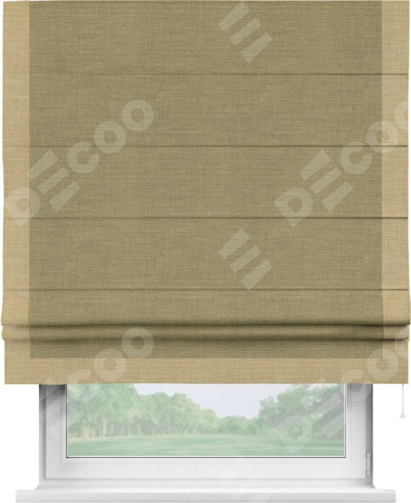 Римская штора производителя «Cortin», используется для проёма, пошита из ткани лён коричневый, артикул 7443. Отделка шторы кантом «Виктория», ткань для канта используется из льна разной расцветки на выбор. Имеет универсальный механизм и подходит для монтажа: на потолок, на стену и в нишу.