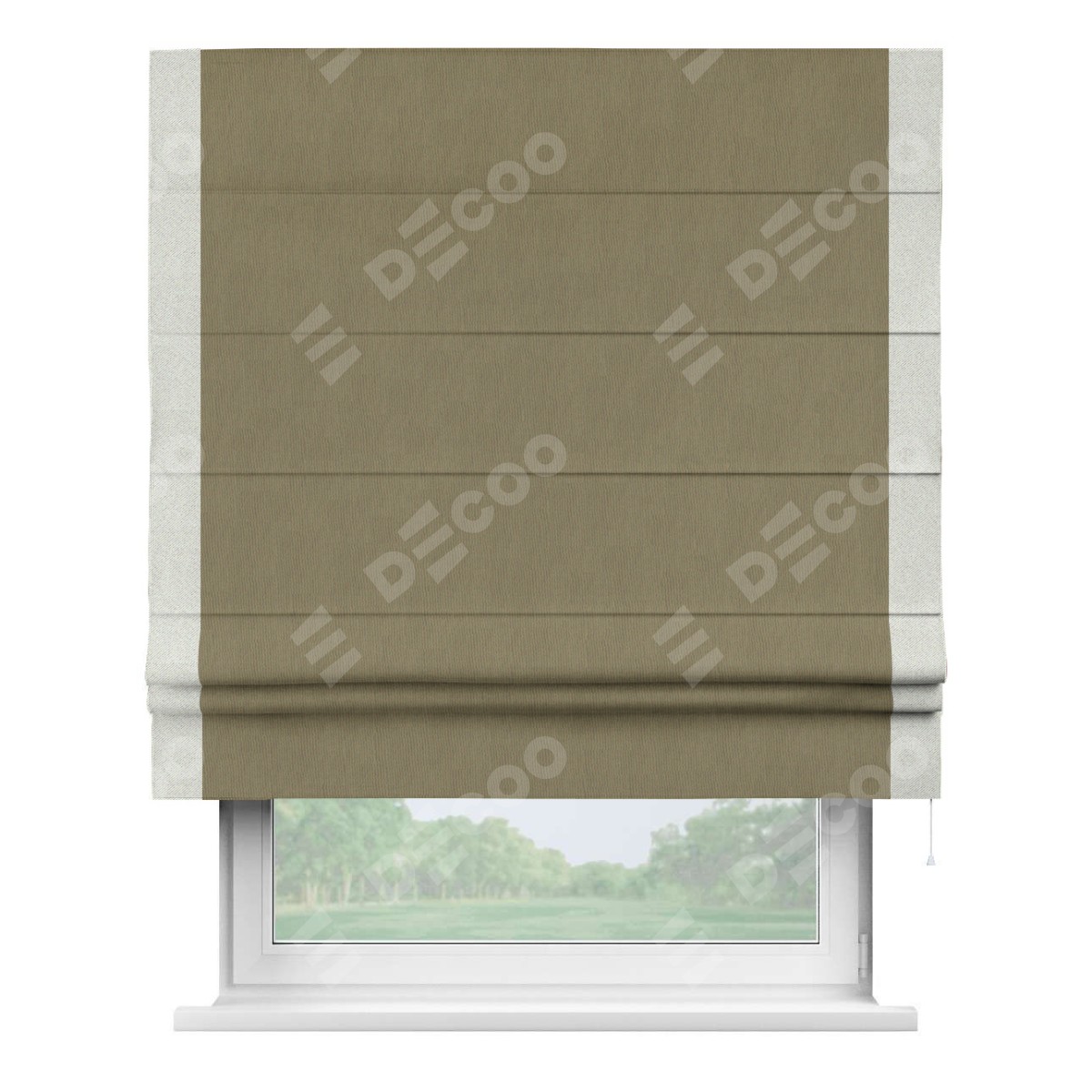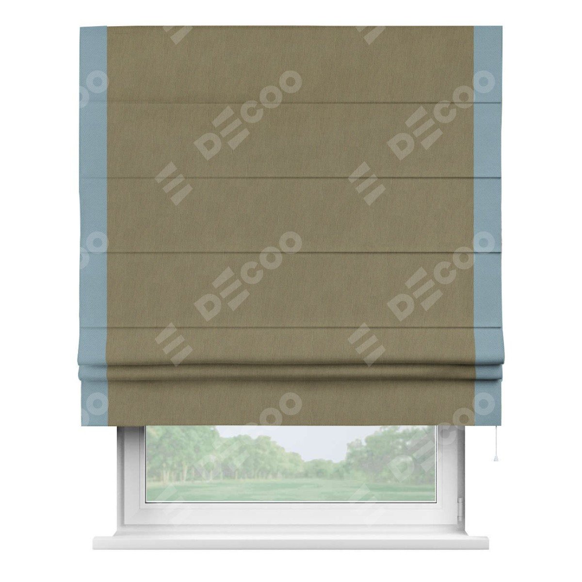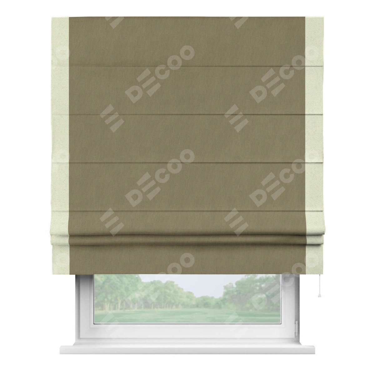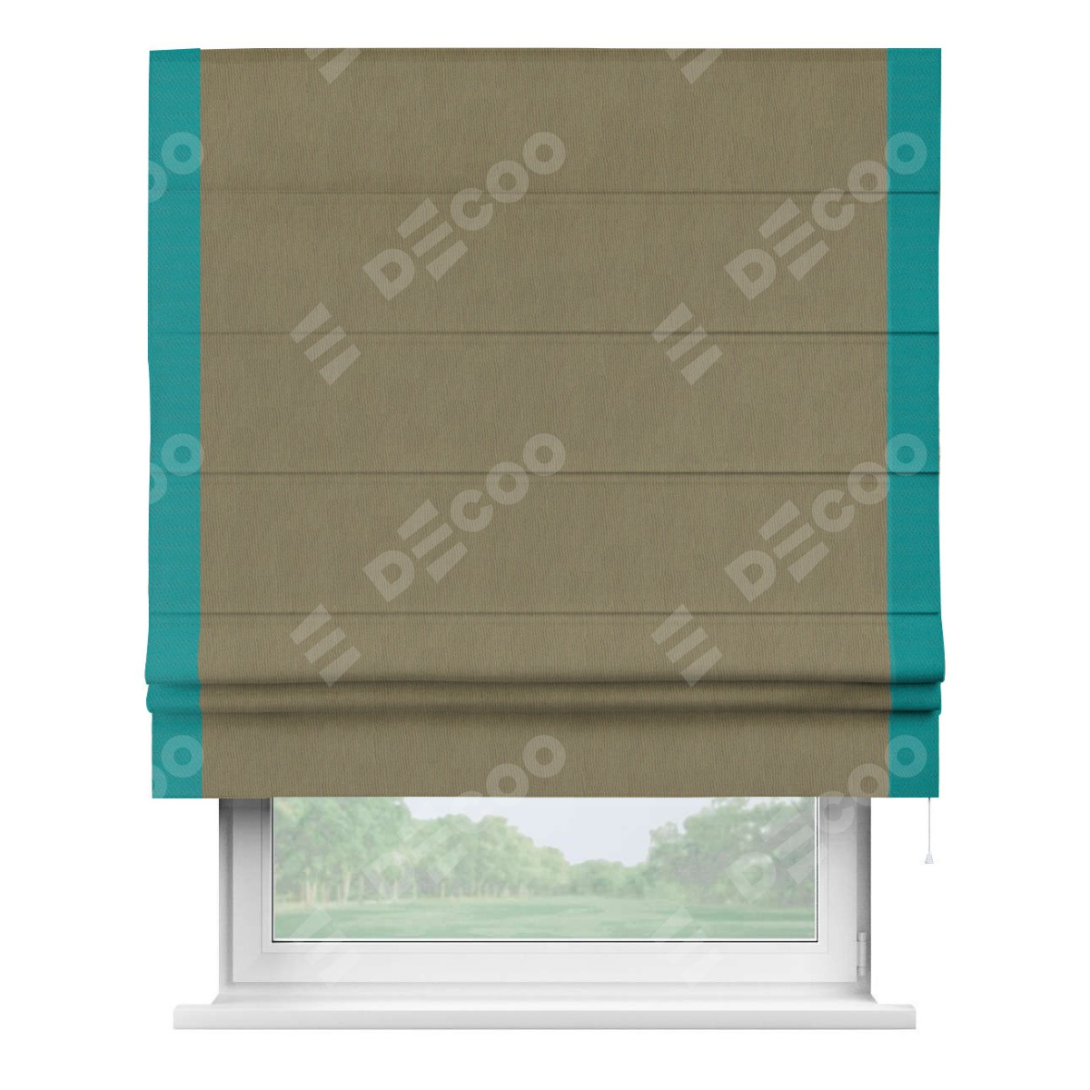 Римская штора производителя «Cortin», используется для проёма, пошита из ткани блэкаут однотонный бежево-золотой, артикул ткани 12095−2. Отделка шторы кантом «Стрим Дуо», ткань для канта используется из блэкаута однотонного разной расцветки на выбор. Имеет универсальный механизм и подходит для монтажа: на потолок, на стену и в нишу.