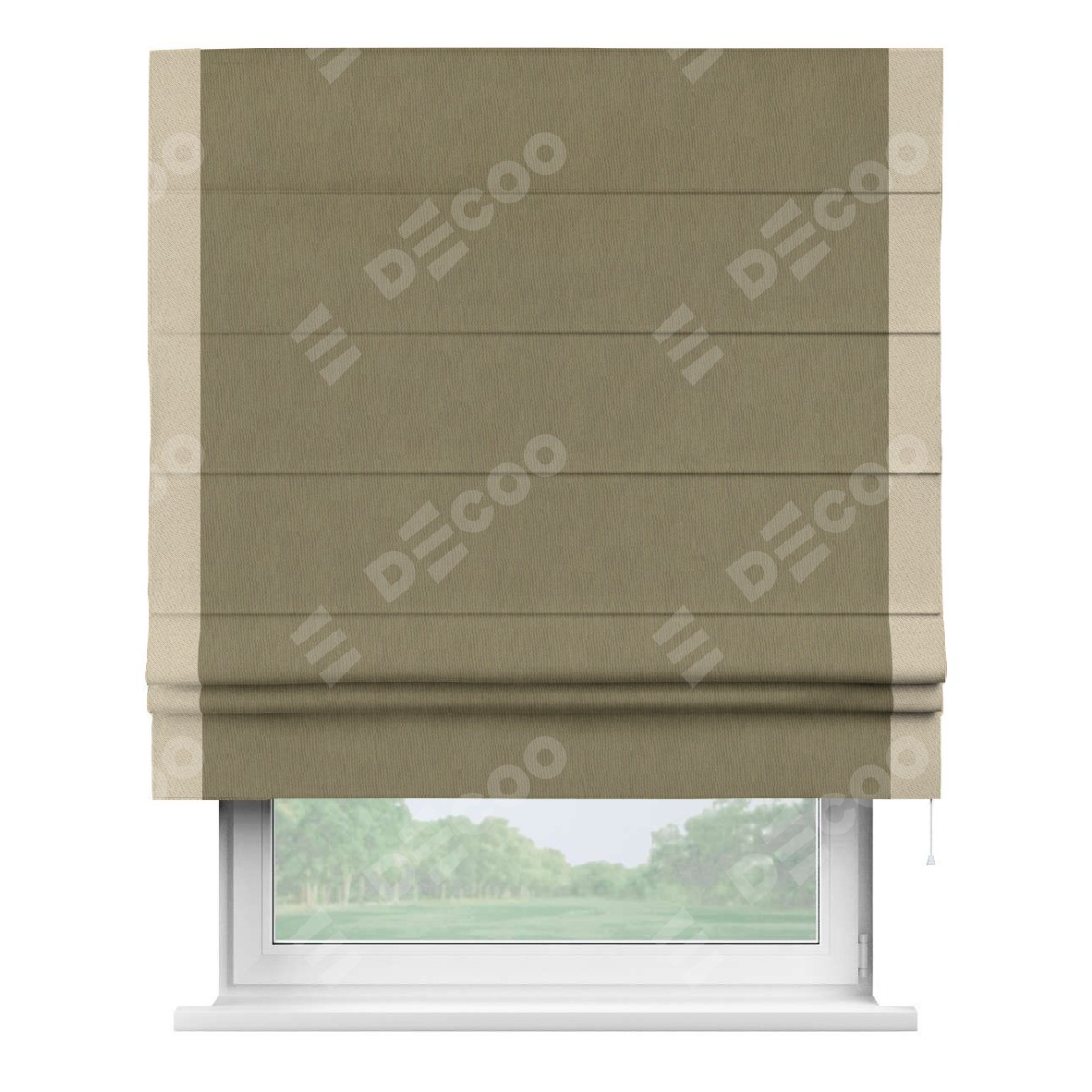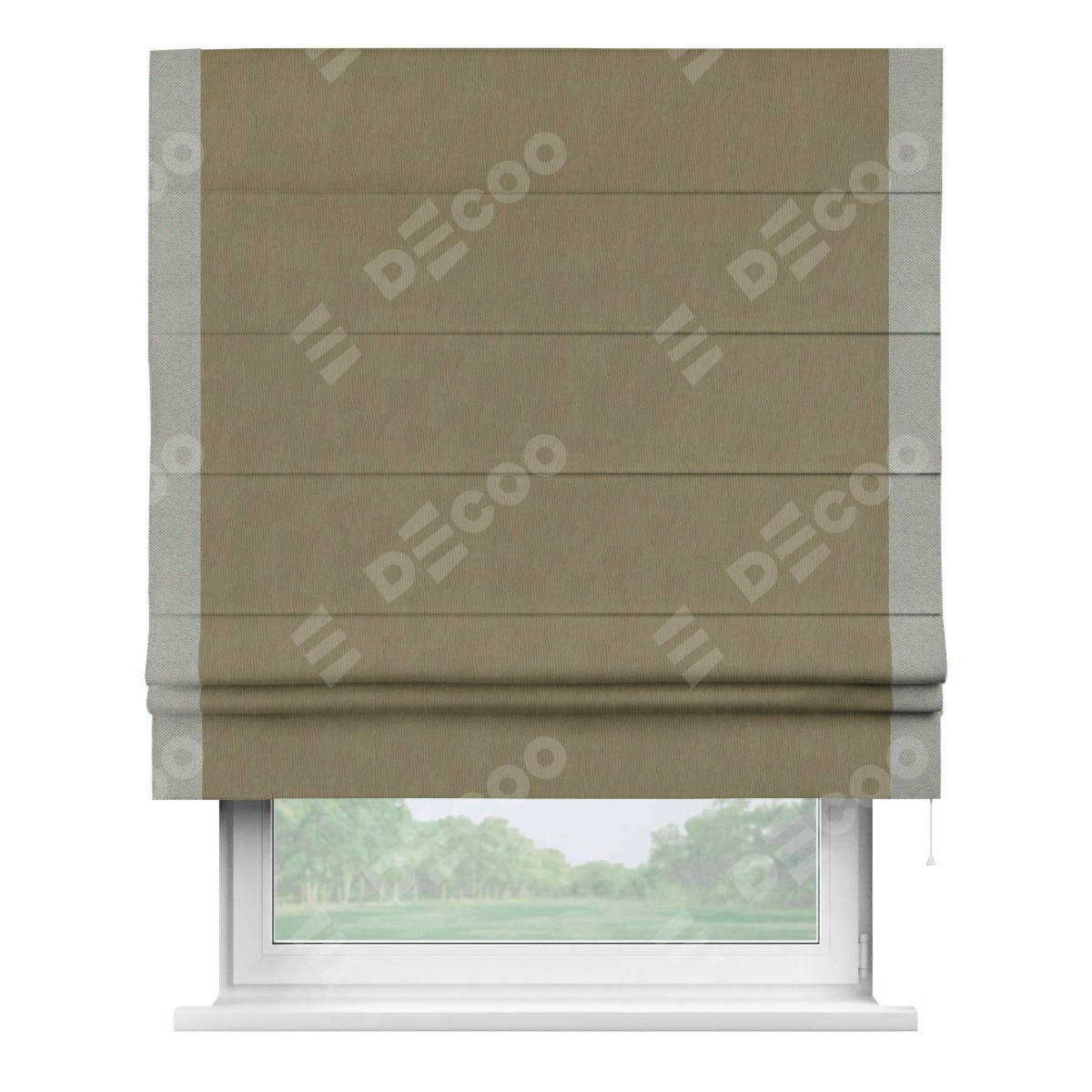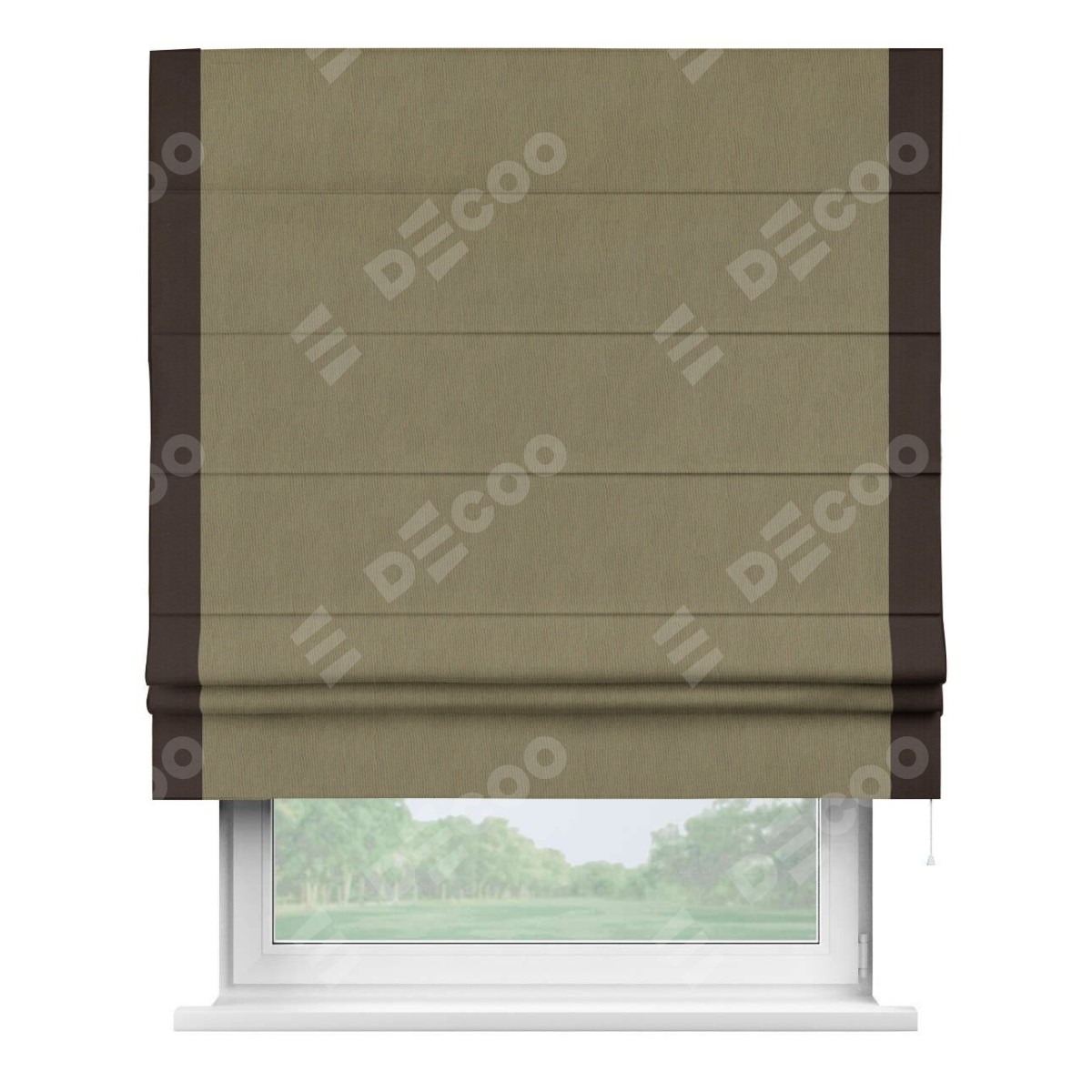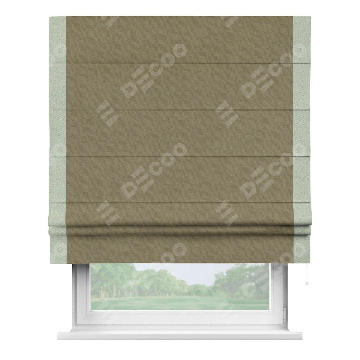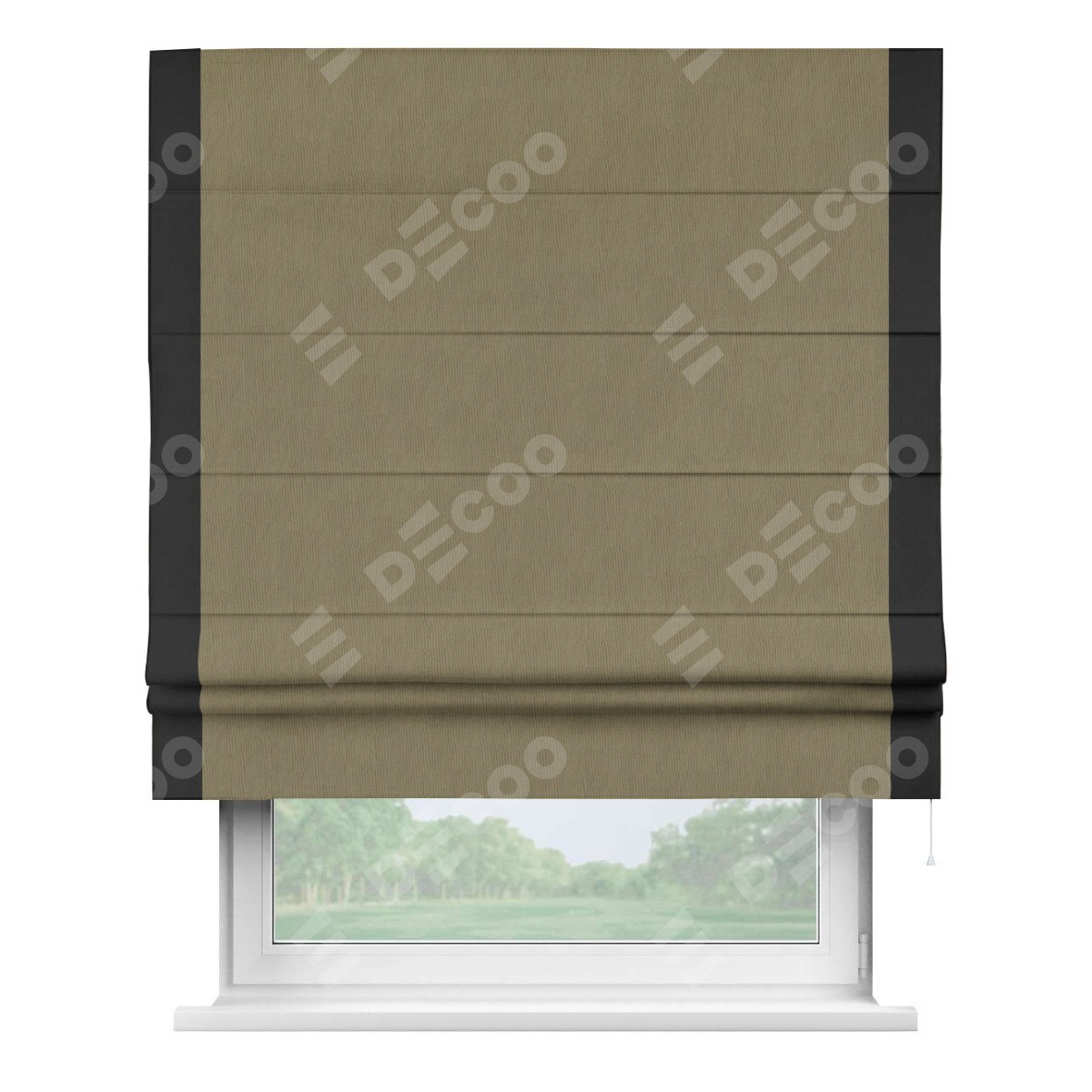 Римская штора производителя «Cortin», используется для проёма, пошита из ткани блэкаут однотонный бежево-золотой, артикул ткани 12095−2. Отделка шторы кантом «Стрим Дуо», ткань для канта используется из блэкаута однотонного разной расцветки на выбор. Имеет универсальный механизм и подходит для монтажа: на потолок, на стену и в нишу.