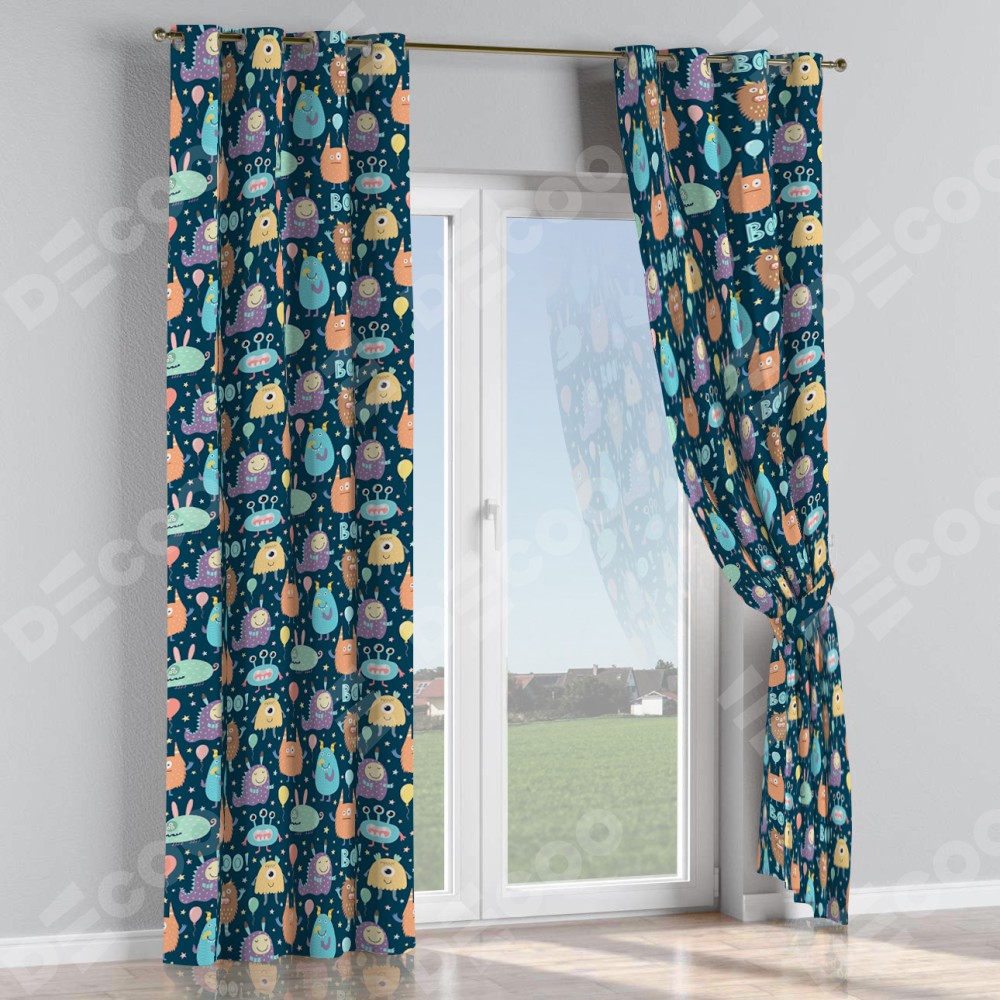 Комплект прямых штор, от производителя «Cortin», пошиты из ткани блэкаут с нанесением сублимационной печати «Звёздные страшилки». Данная модель пошита на люверсах, комплектуется на выбор круглым карнизом и подходит для монтажа на стену или потолок. Прямые шторы на люверсах шьются по стандарту с коэффициентом 1/2 (на 100 см. ширины проёма 200 см. ширины ткани), отличительным преимуществом данной модели является простой способ монтажа. Достаточно повесить ее на трубу и штора готова!