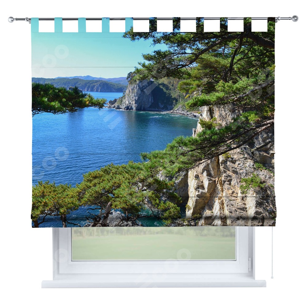 Римская штора производителя «Cortin», используется для проёма, пошита из ткани блэкаут с нанесением сублимационной печати «Море и сосны». Данная модель пошита на петлях, комплектуется на выбор круглым карнизом и подходит для монтажа на стену. Римская штора на петлях имеет простую систему регулировки высоты, отличительным преимуществом данной модели является простой способ монтажа. Достаточно повесить ее на трубу и штора готова!