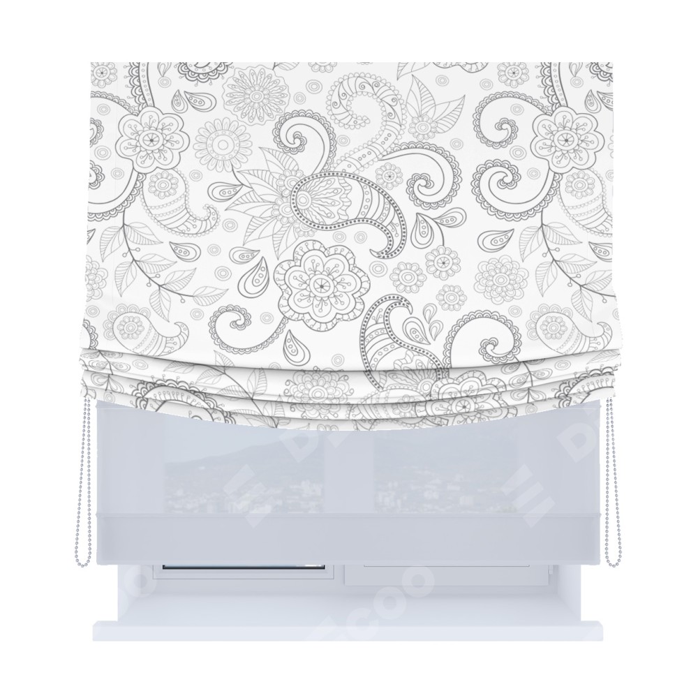 Римская штора день-ночь производителя «Cortin», используется для проёма, пошита из двух полотен, с лицевой блэкаут с нанесением сублимационной печати «Изысканный пейсли», вторая ткань тюль (по стандарту комплектуется тюль белого цвета артикул V-01). Имеет универсальный механизм и подходит для монтажа: на потолок, на стену и в нишу. Удобное управление каждой шторой отдельно.