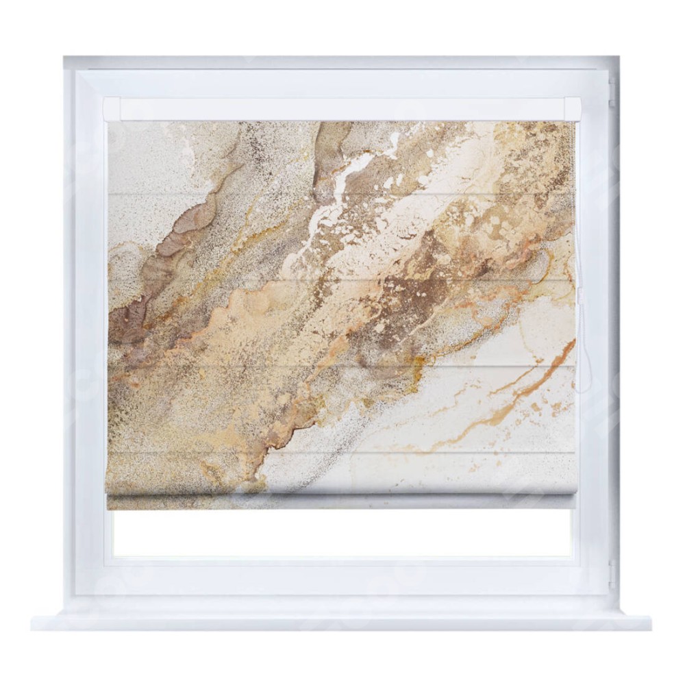 Римская штора производителя «Cortin», устанавливается на створку окна, пошита из ткани блэкаут с нанесением сублимационной печати «Бежево-золотой мрамор». Штора шьётся по индивидуальным размерам, для данного типа римской шторы возможная ширина от 35 до 150 см., высота до 250 см.