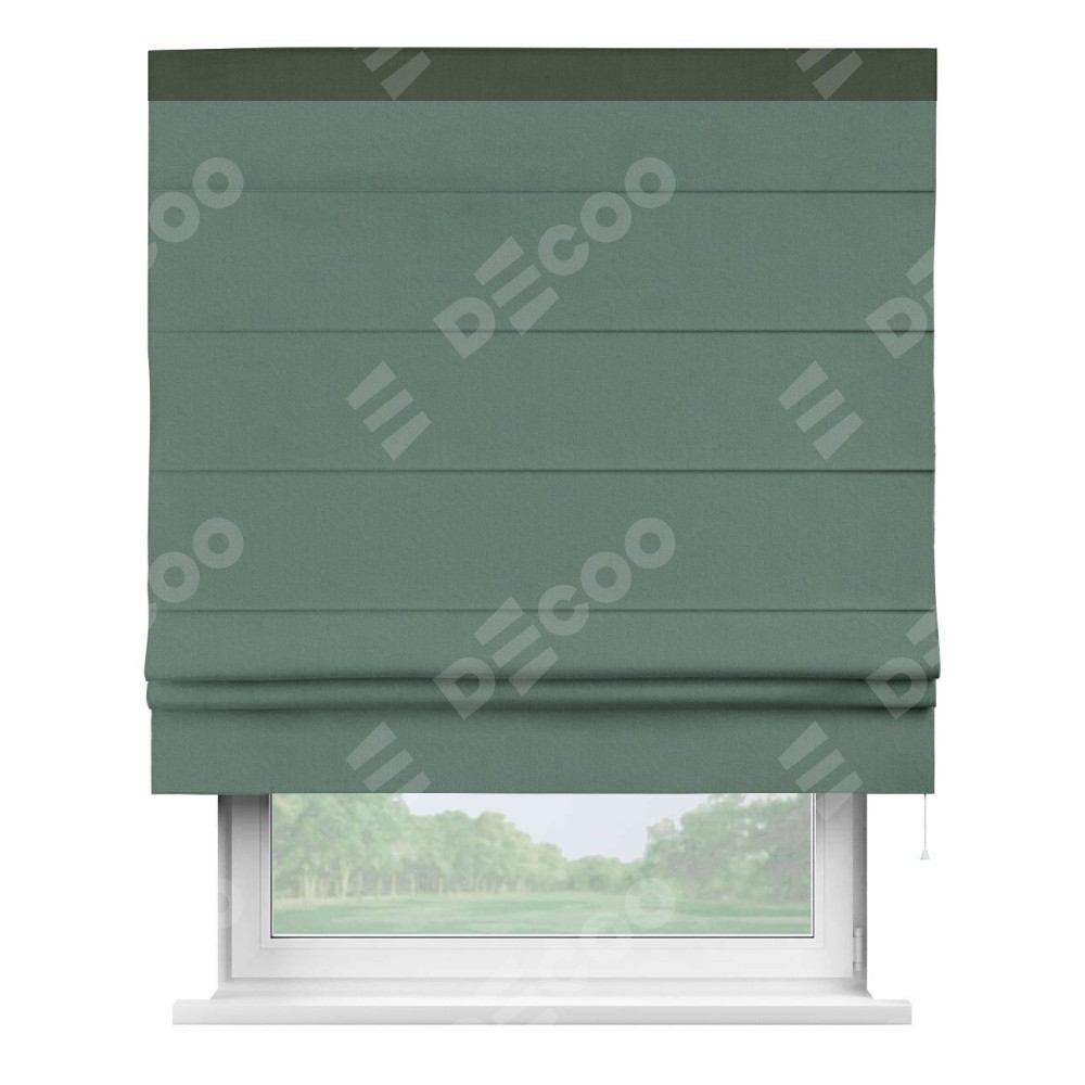 Римская штора производителя «Cortin», используется для проёма, пошита из ткани лён блэкаут бирюзовый, артикул 69517. Отделка шторы кантом «Кинг», ткань для канта используется из льна разной расцветки на выбор. Имеет универсальный механизм и подходит для монтажа: на потолок, на стену и в нишу.
