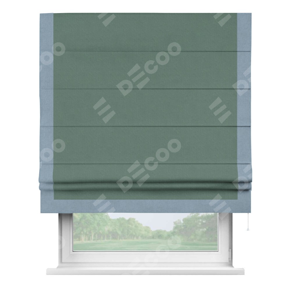 Римская штора производителя «Cortin», используется для проёма, пошита из ткани лён блэкаут бирюзовый, артикул 69517. Отделка шторы кантом «Виктория», ткань для канта используется из льна разной расцветки на выбор. Имеет универсальный механизм и подходит для монтажа: на потолок, на стену и в нишу.