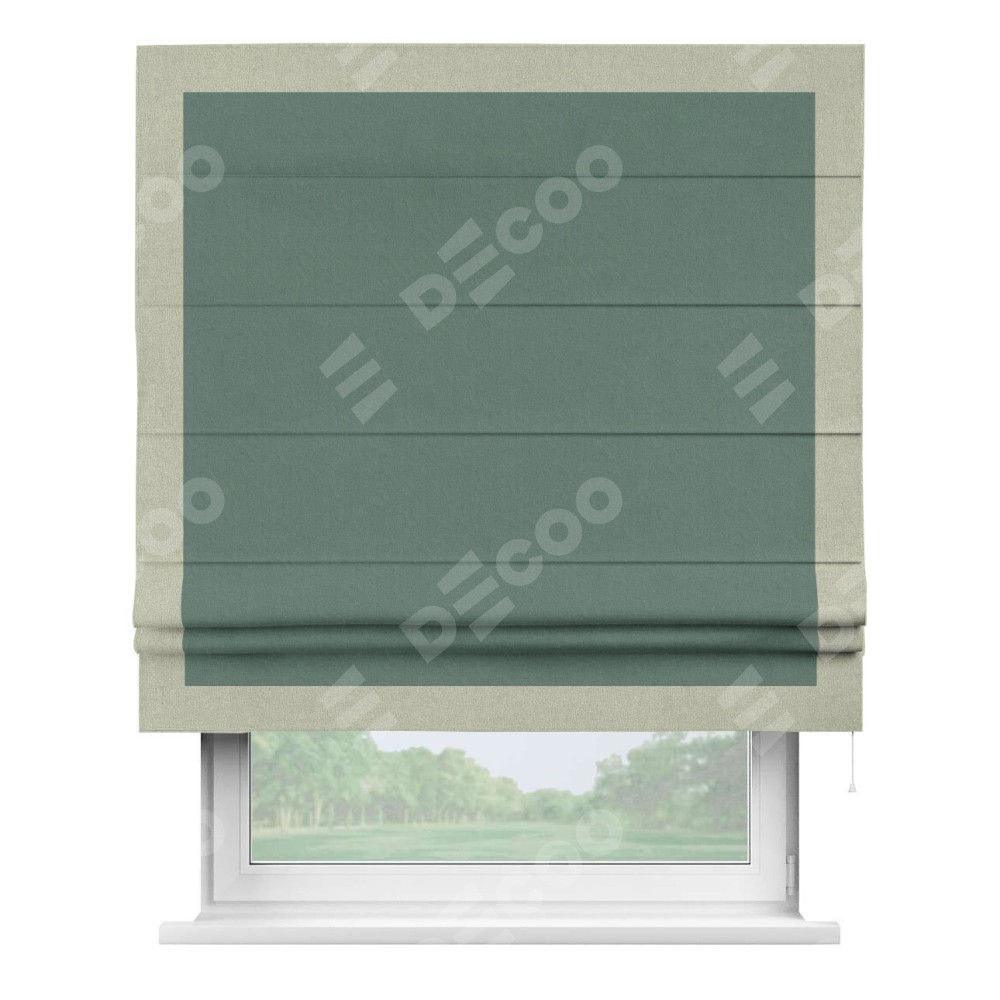 Римская штора производителя «Cortin», используется для проёма, пошита из ткани лён блэкаут бирюзовый, артикул 69517. Отделка шторы кантом «Чесс», ткань для канта используется из льна разной расцветки на выбор. Имеет универсальный механизм и подходит для монтажа: на потолок, на стену и в нишу.