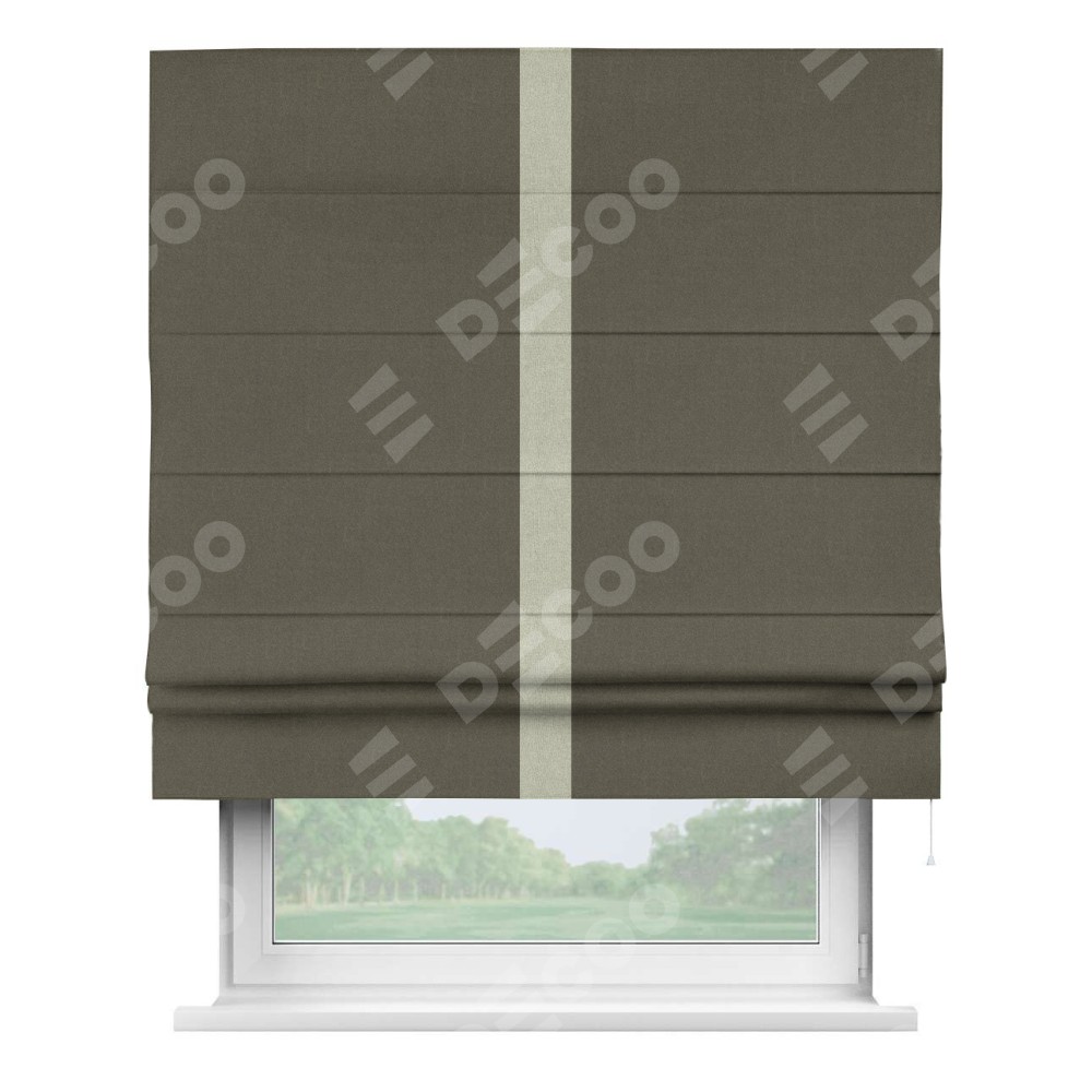 Римская штора производителя «Cortin», используется для проёма, пошита из ткани лён блэкаут коричневый, артикул 69383. Отделка шторы кантом «Хайвэй», ткань для канта используется из льна разной расцветки на выбор. Имеет универсальный механизм и подходит для монтажа: на потолок, на стену и в нишу.
