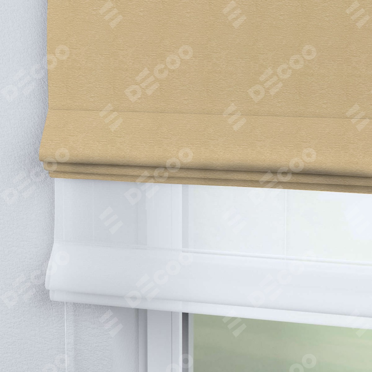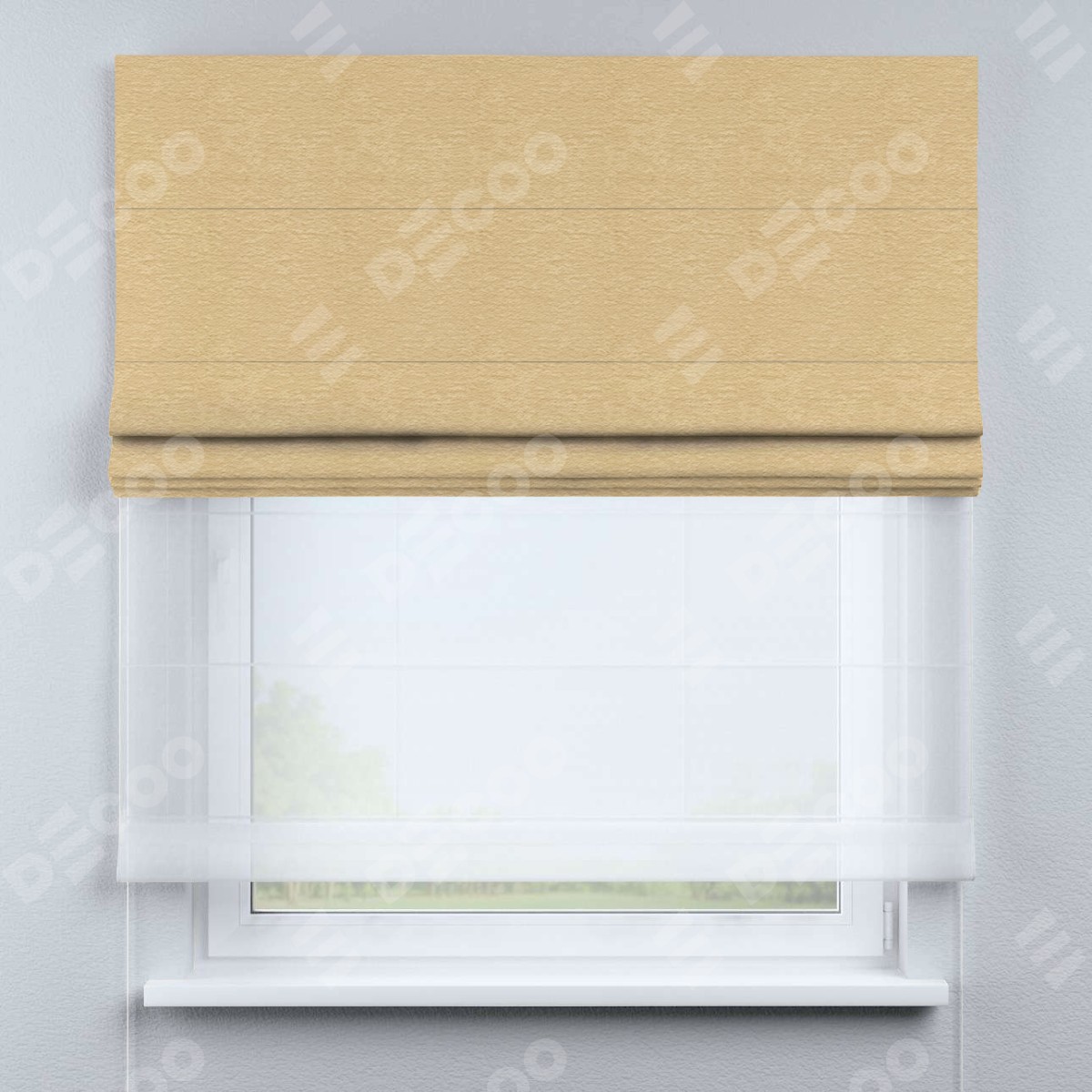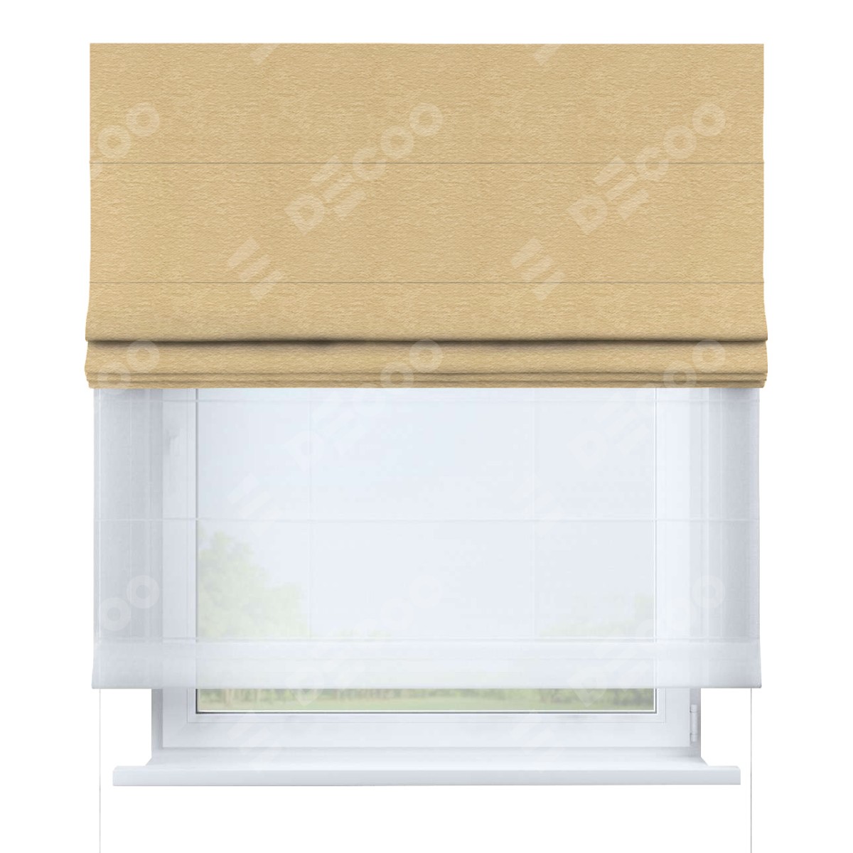 Римская штора день-ночь производителя «Cortin», используется для проёма, пошита из двух полотен, с лицевой стороны софт однотонный бежевый артикул 4202 05, вторая ткань тюль (по стандарту комплектуется тюль белого цвета артикул V-01). Имеет универсальный механизм и подходит для монтажа: на потолок, на стену и в нишу.