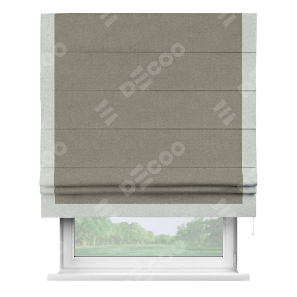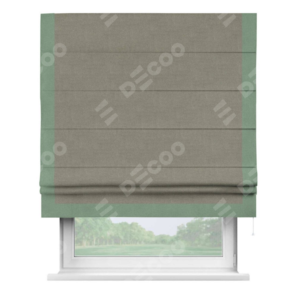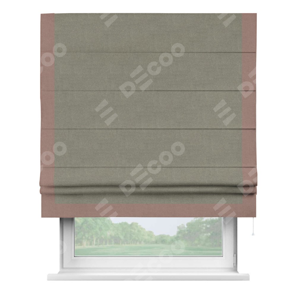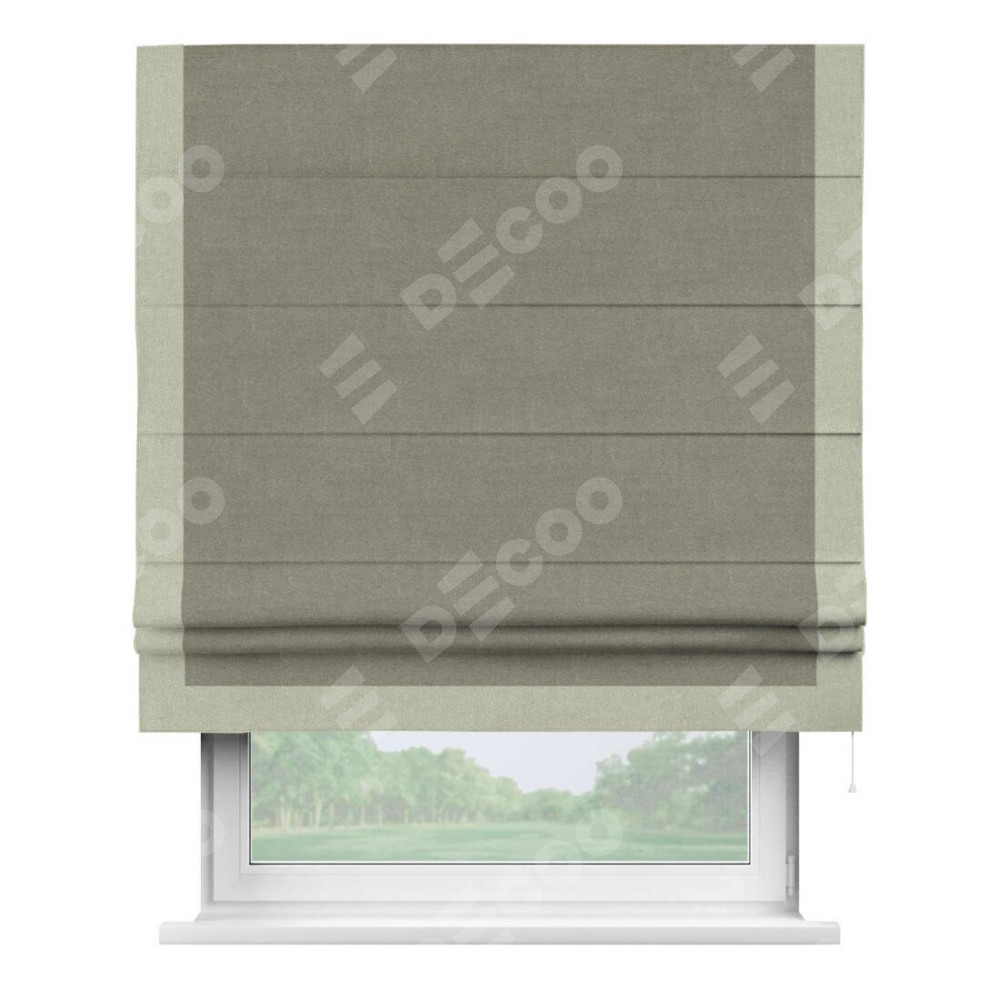 Римская штора производителя «Cortin», используется для проёма, пошита из ткани лён блэкаут шампань, артикул 69449. Отделка шторы кантом «Виктория», ткань для канта используется из льна разной расцветки на выбор. Имеет универсальный механизм и подходит для монтажа: на потолок, на стену и в нишу.