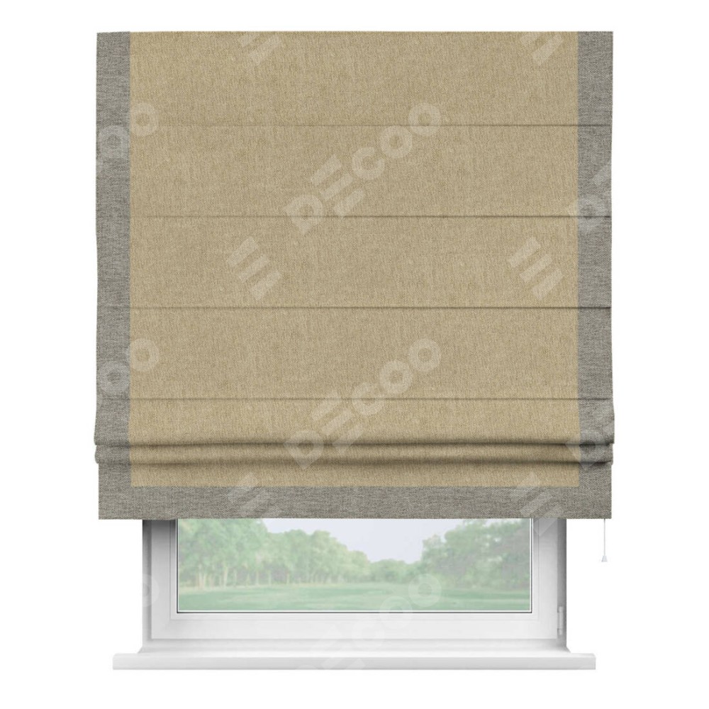 Римская штора производителя «Cortin», используется для проёма, пошита из ткани стиф димаут бежевый, артикул 18083. Отделка шторы кантом «Виктория», ткань для канта используется из стифа разной расцветки на выбор. Имеет универсальный механизм и подходит для монтажа: на потолок, на стену и в нишу.