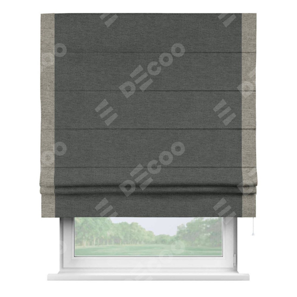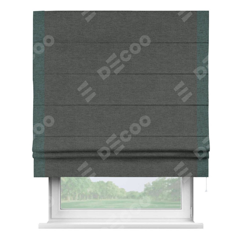 Римская штора производителя «Cortin», используется для проёма, пошита из ткани стиф димаут графит, артикул 44026. Отделка шторы кантом «Стрим Дуо», ткань для канта используется из стифа разной расцветки на выбор. Имеет универсальный механизм и подходит для монтажа: на потолок, на стену и в нишу.