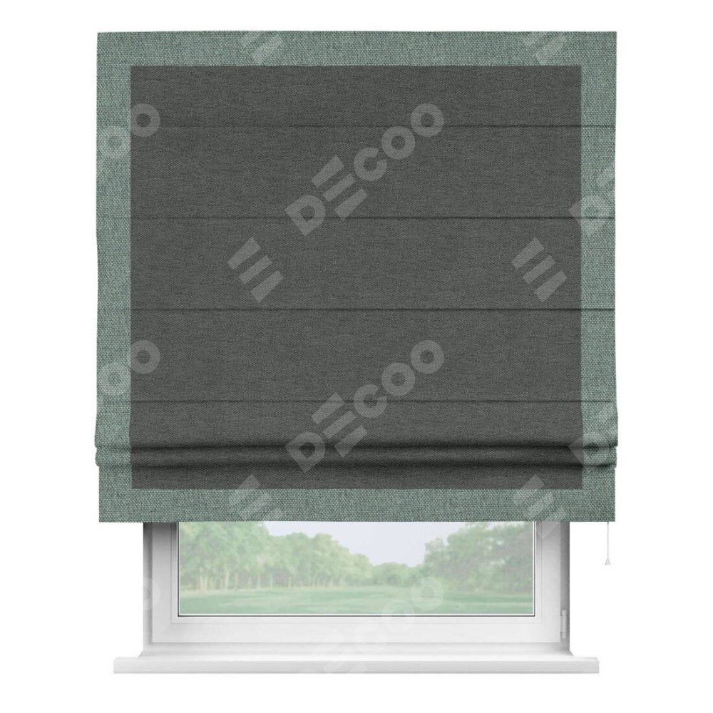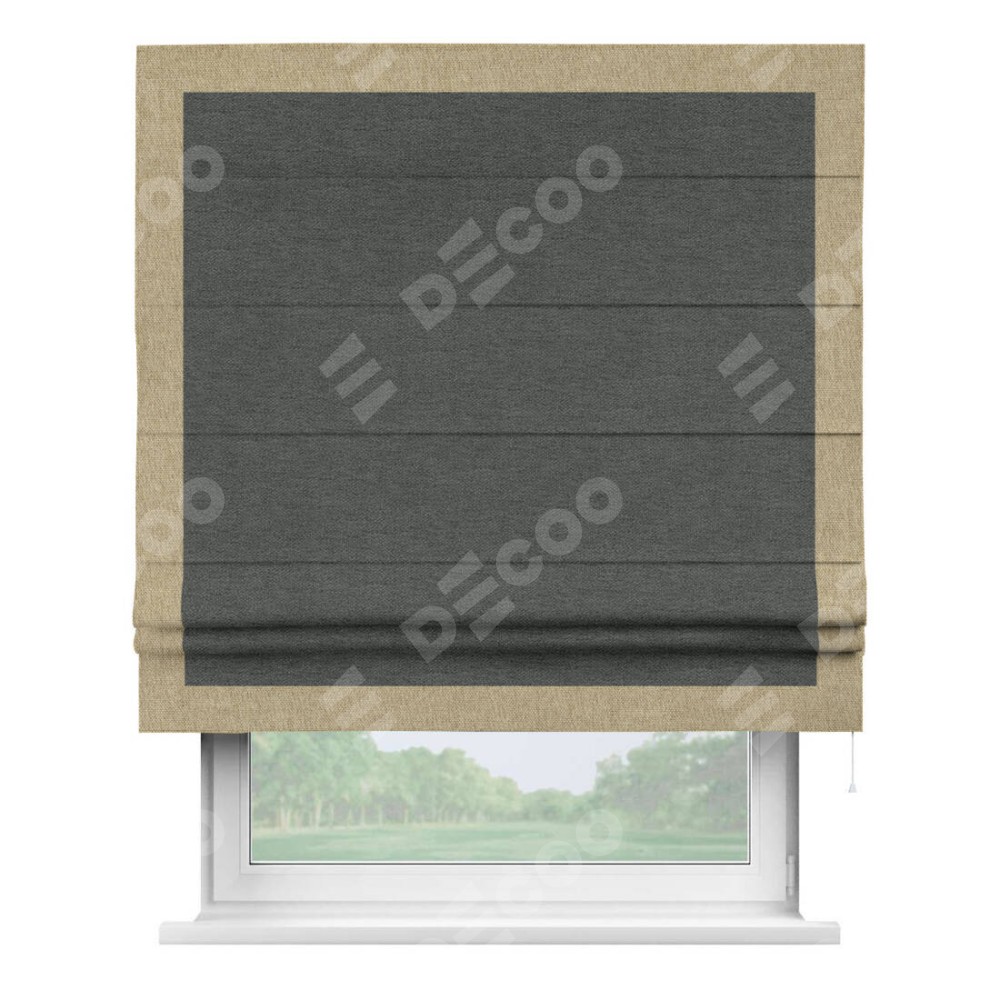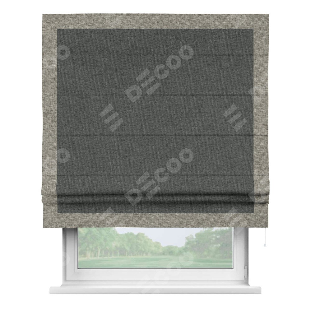 Римская штора производителя «Cortin», используется для проёма, пошита из ткани стиф димаут графит, артикул 44026. Отделка шторы кантом «Чесс», ткань для канта используется из стифа разной расцветки на выбор. Имеет универсальный механизм и подходит для монтажа: на потолок, на стену и в нишу.