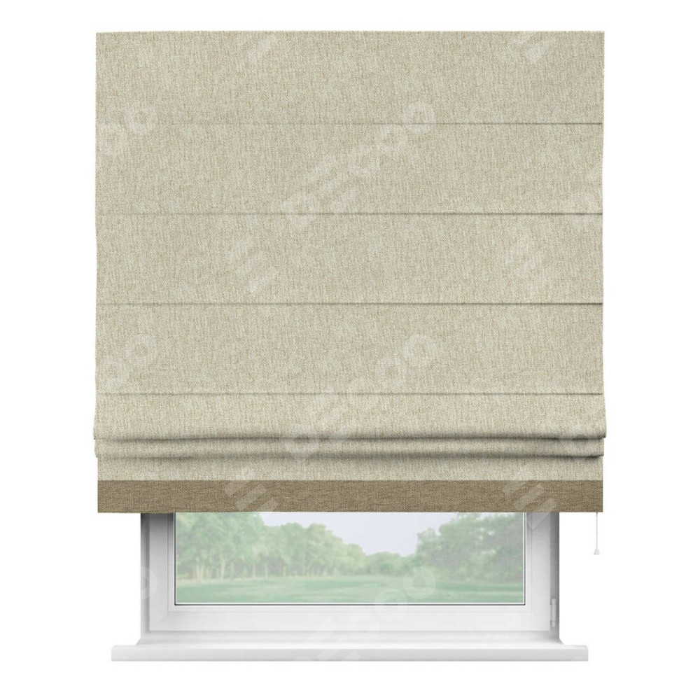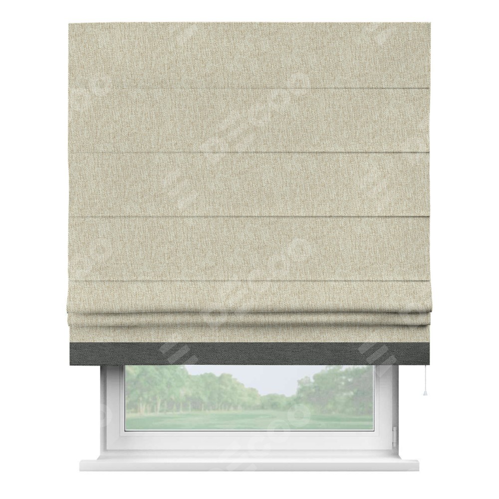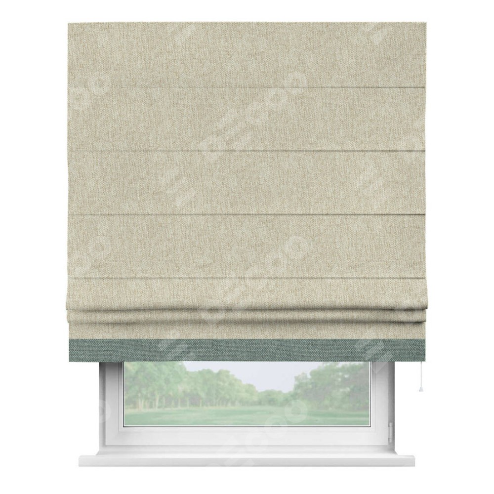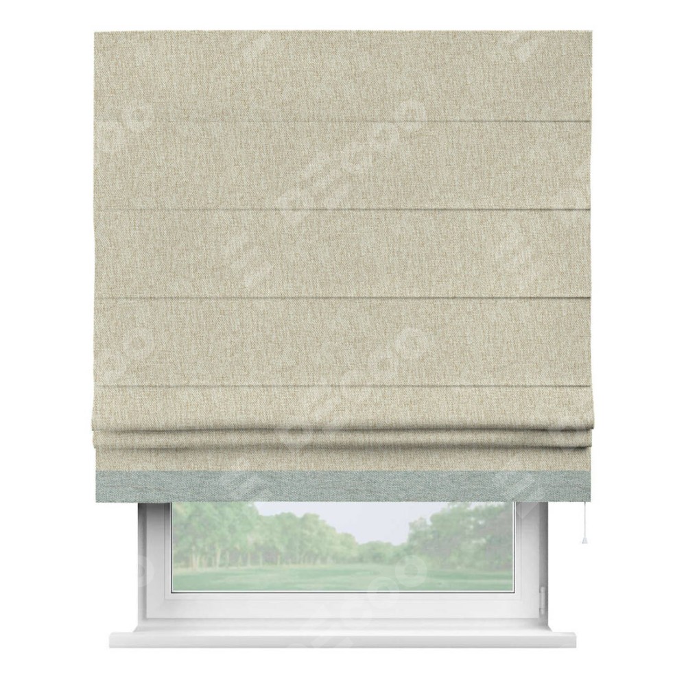 Римская штора производителя «Cortin», используется для проёма, пошита из ткани стиф димаут светло-бежевый, артикул 18084. Отделка шторы кантом «Джестер», ткань для канта используется из стифа разной расцветки на выбор. Имеет универсальный механизм и подходит для монтажа: на потолок, на стену и в нишу.