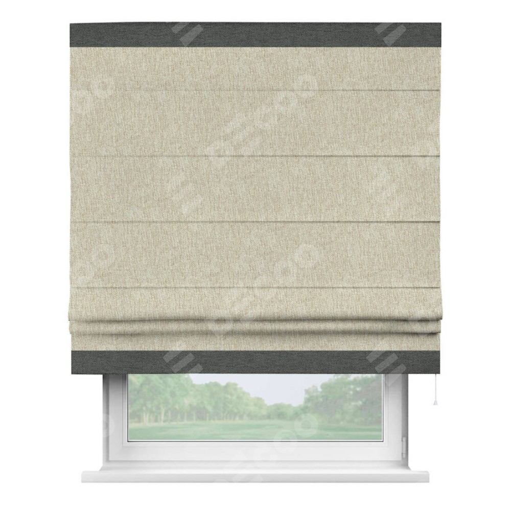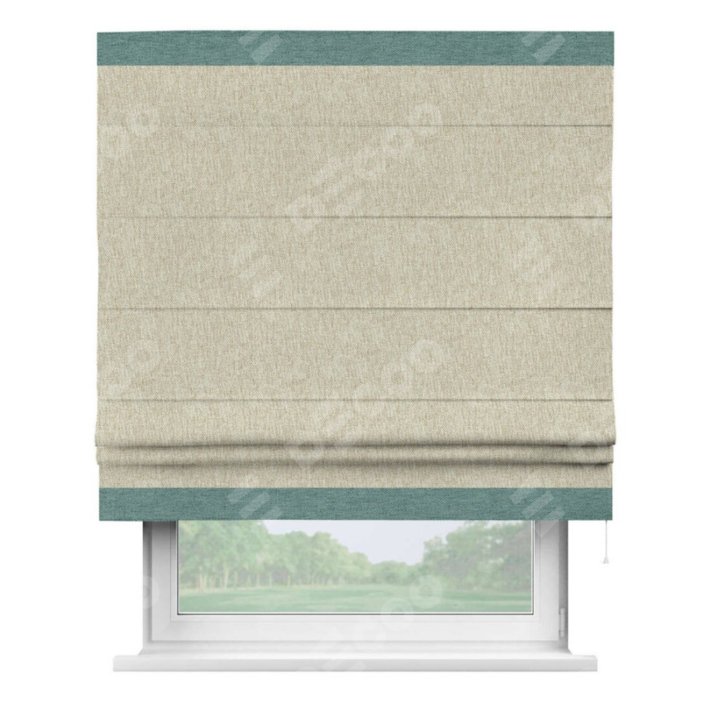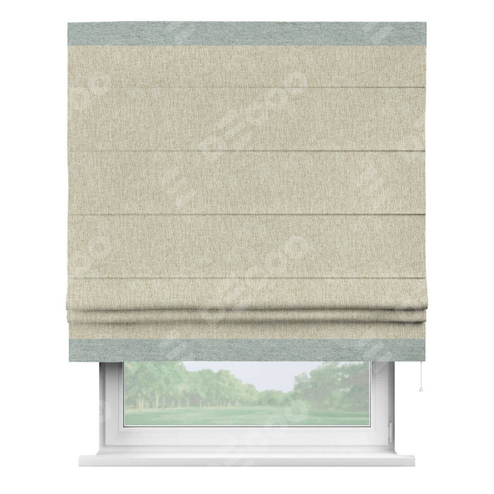 Римская штора производителя «Cortin», используется для проёма, пошита из ткани стиф димаут светло-бежевый, артикул 18084. Отделка шторы кантом «Горизонт», ткань для канта используется из стифа разной расцветки на выбор. Имеет универсальный механизм и подходит для монтажа: на потолок, на стену и в нишу.