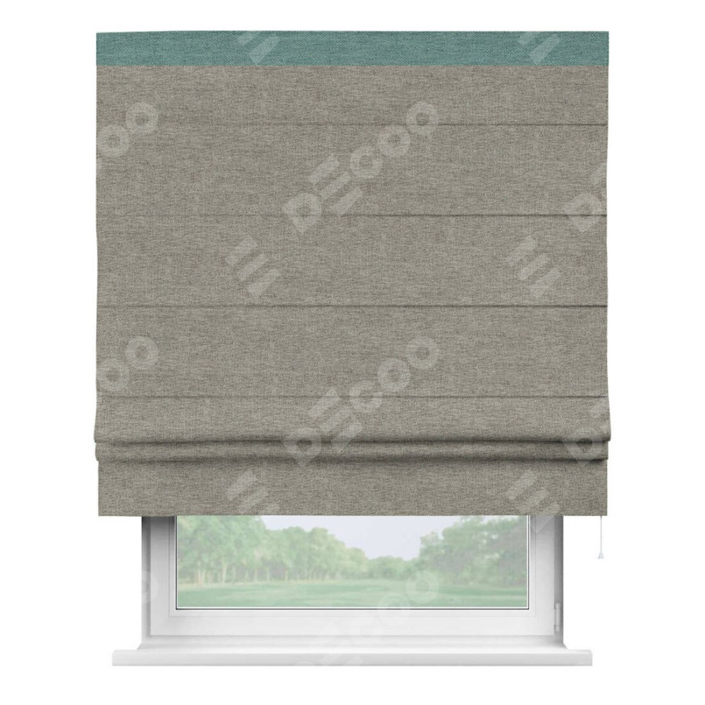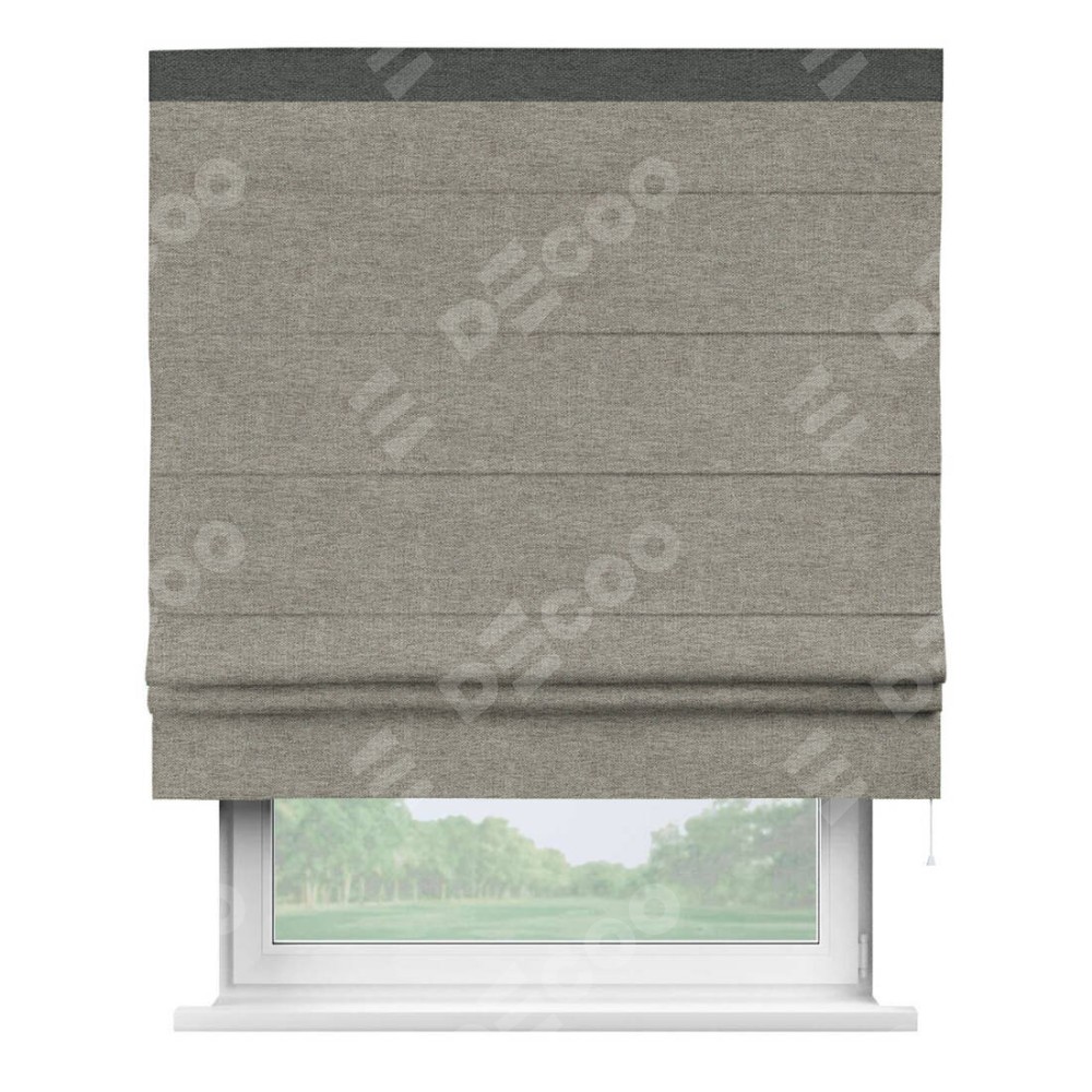 Римская штора производителя «Cortin», используется для проёма, пошита из ткани стиф димаут серо-коричневый, артикул 44028. Отделка шторы кантом «Кинг», ткань для канта используется из стифа разной расцветки на выбор. Имеет универсальный механизм и подходит для монтажа: на потолок, на стену и в нишу.
