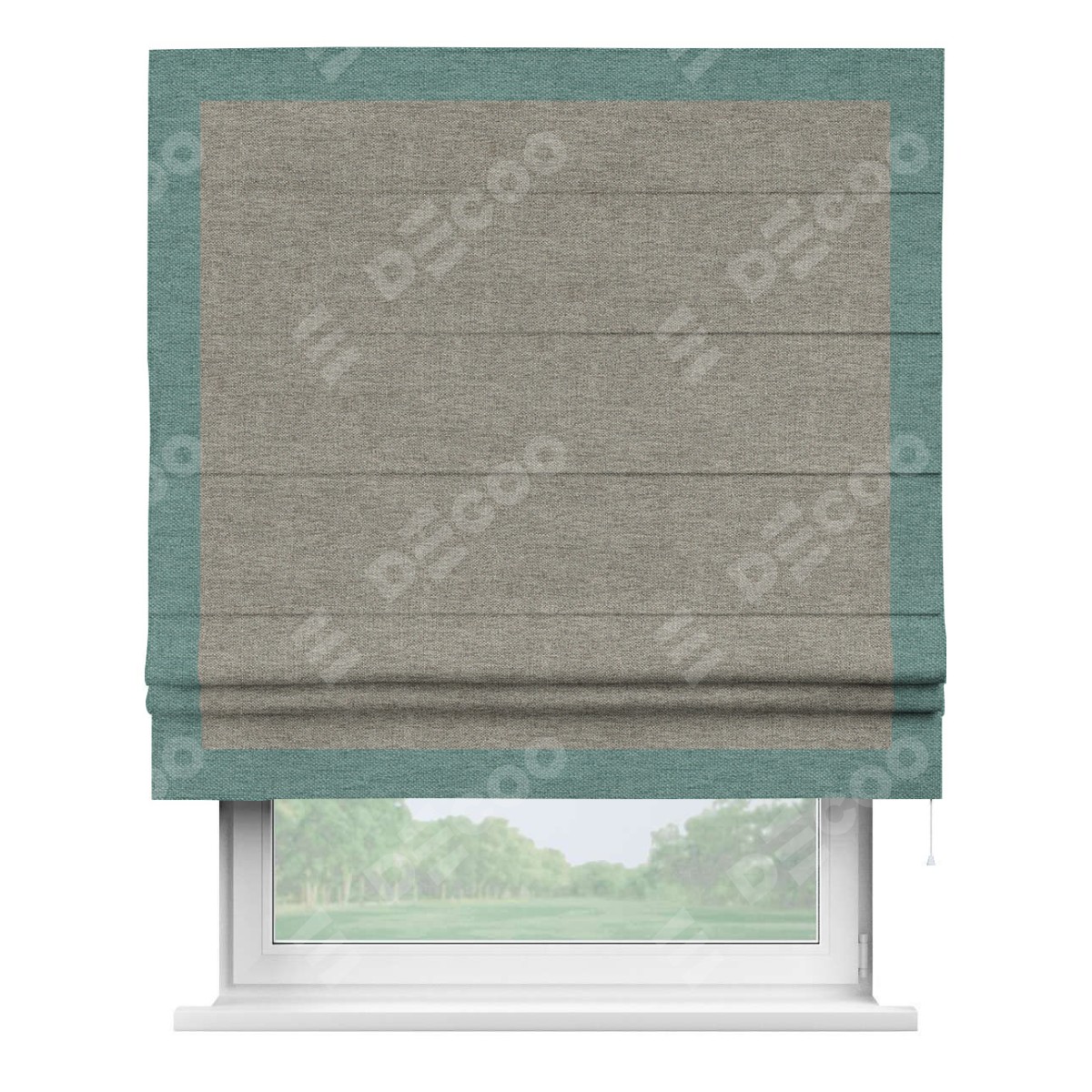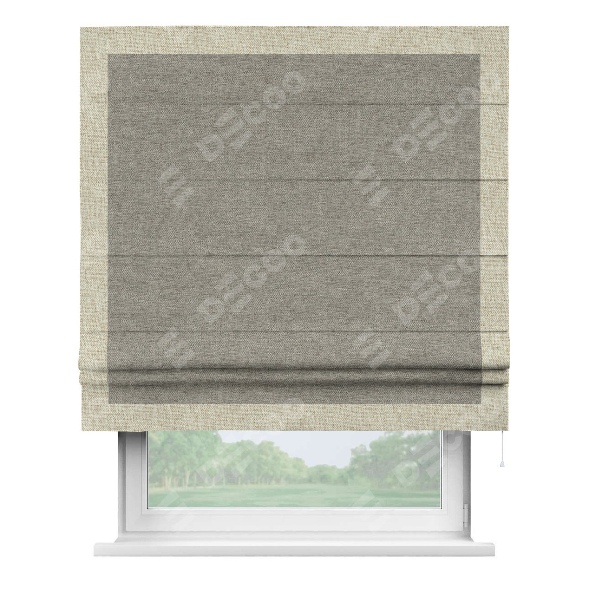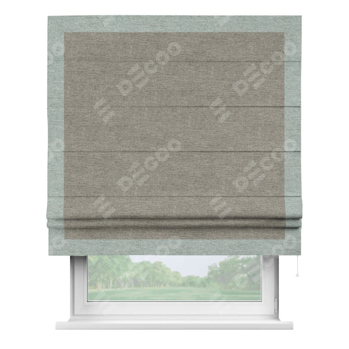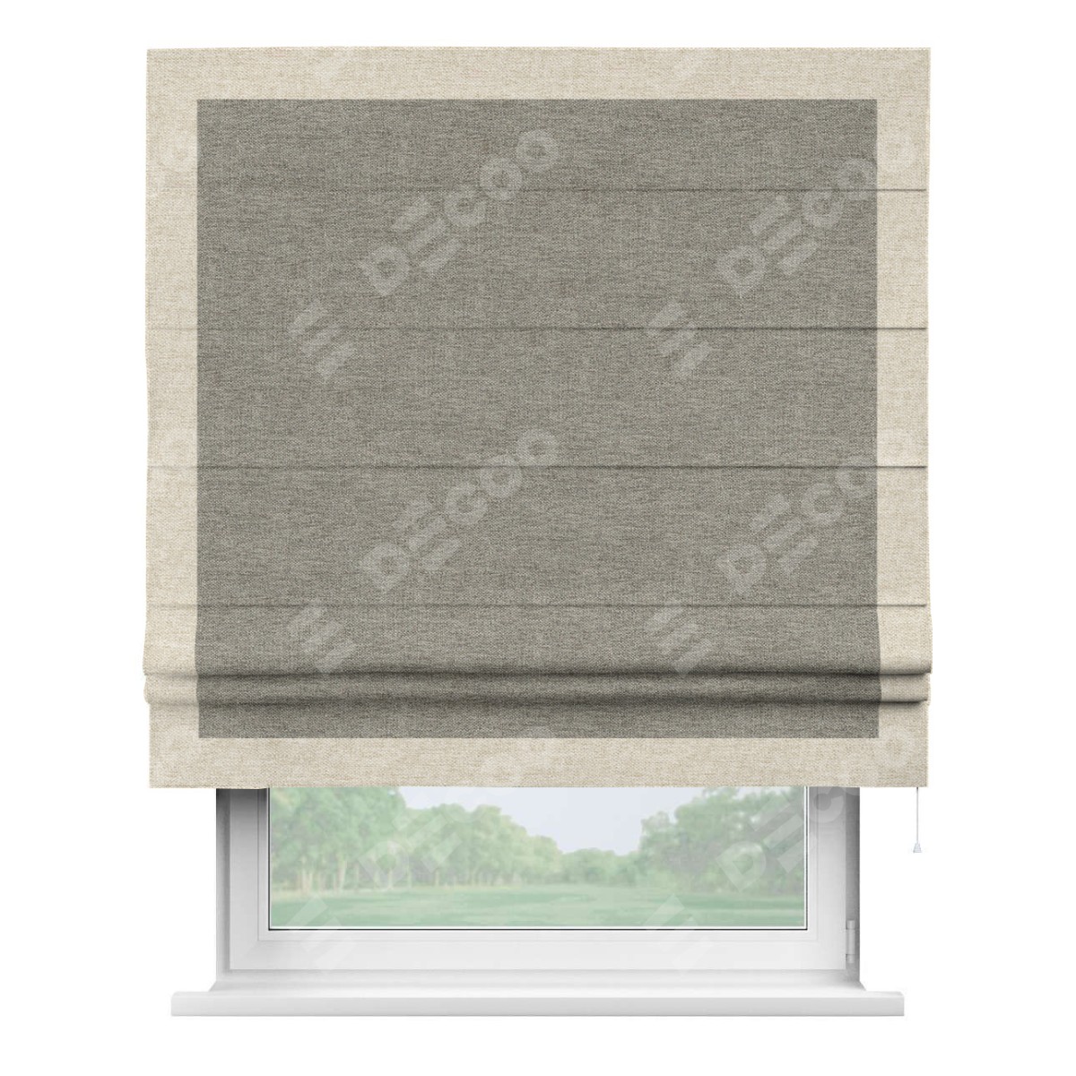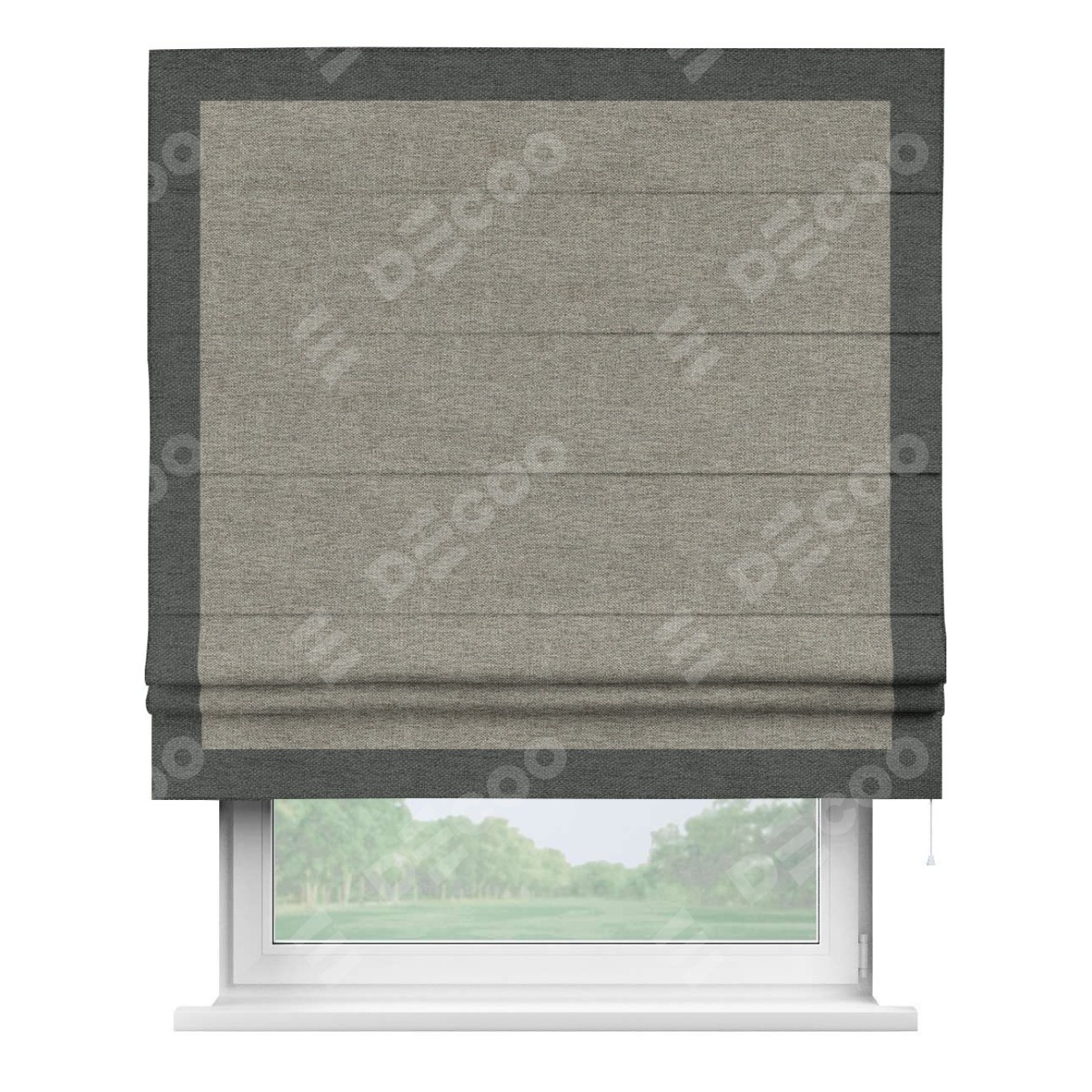 Римская штора производителя «Cortin», используется для проёма, пошита из ткани стиф димаут серо-коричневый, артикул 44028. Отделка шторы кантом «Чесс», ткань для канта используется из стифа разной расцветки на выбор. Имеет универсальный механизм и подходит для монтажа: на потолок, на стену и в нишу.