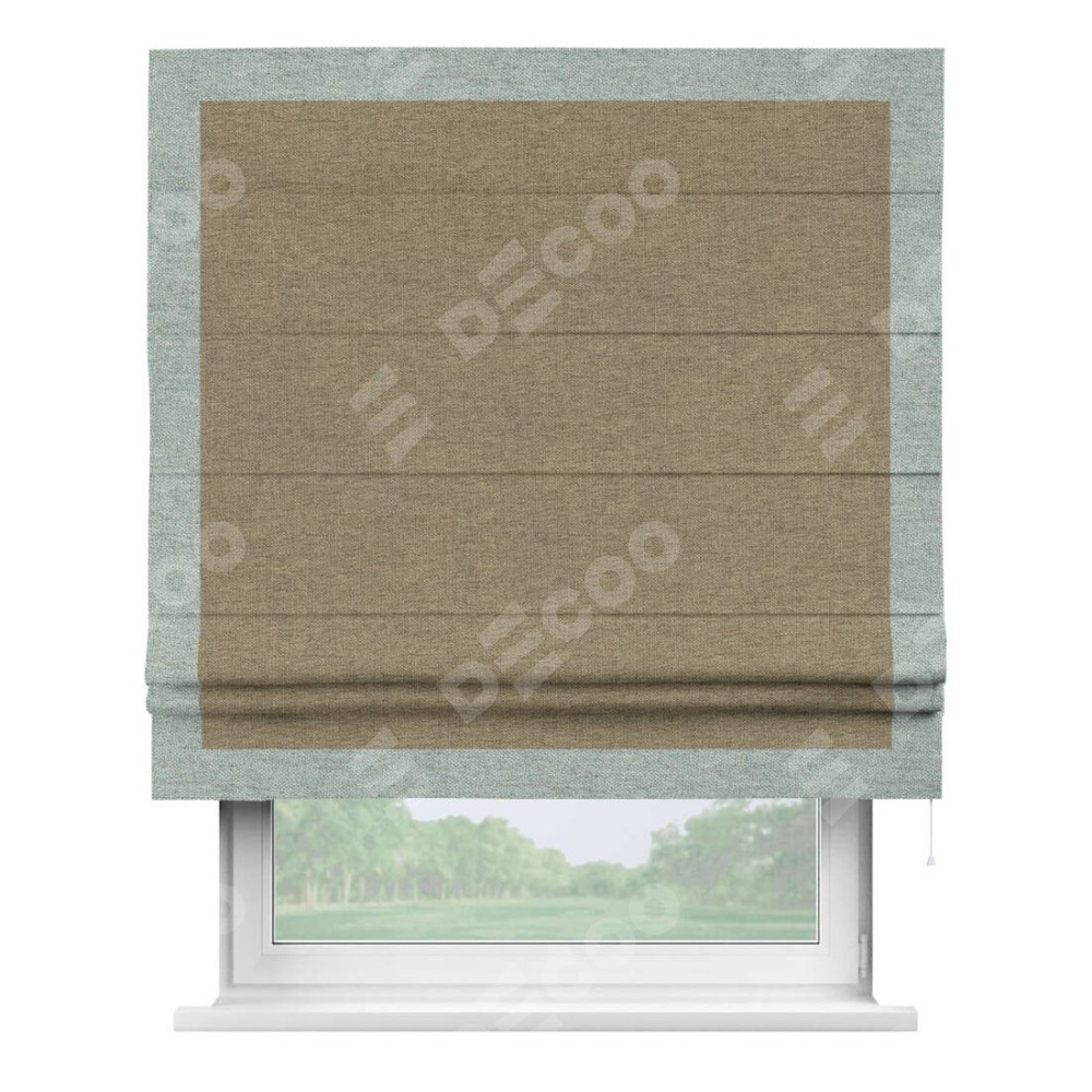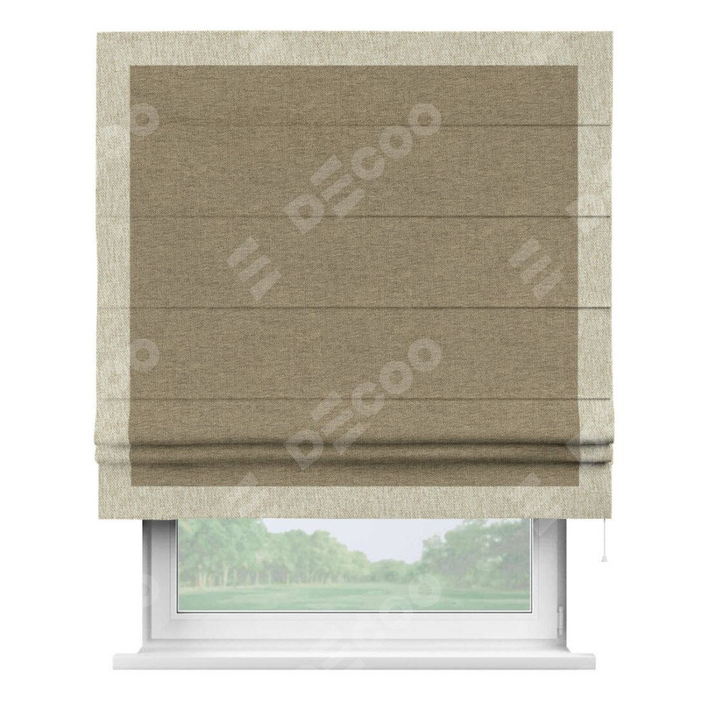 Римская штора производителя «Cortin», используется для проёма, пошита из ткани стиф димаут тёмно-бежевый, артикул 18085. Отделка шторы кантом «Чесс», ткань для канта используется из стифа разной расцветки на выбор. Имеет универсальный механизм и подходит для монтажа: на потолок, на стену и в нишу.