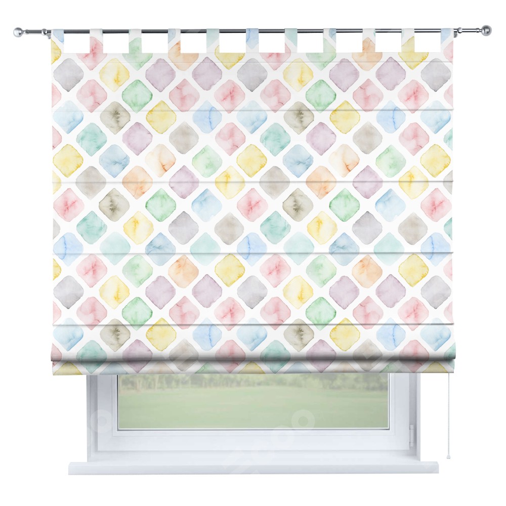 Римская штора производителя «Cortin», используется для проёма, пошита из ткани блэкаут с нанесением сублимационной печати «Мозаика акварель». Данная модель пошита на петлях, комплектуется на выбор круглым карнизом и подходит для монтажа на стену. Римская штора на петлях имеет простую систему регулировки высоты, отличительным преимуществом данной модели является простой способ монтажа. Достаточно повесить ее на трубу и штора готова!