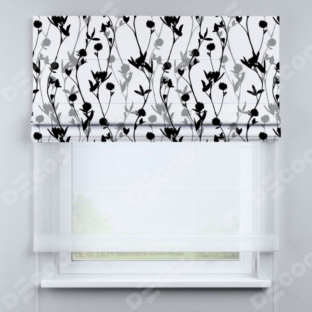 Римская штора день-ночь производителя «Cortin», используется для проёма, пошита из двух полотен, с лицевой блэкаут с нанесением сублимационной печати «Цветочный силуэт», вторая ткань тюль (по стандарту комплектуется тюль белого цвета артикул V-01). Имеет универсальный механизм и подходит для монтажа: на потолок, на стену и в нишу.