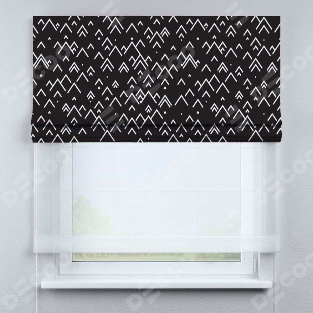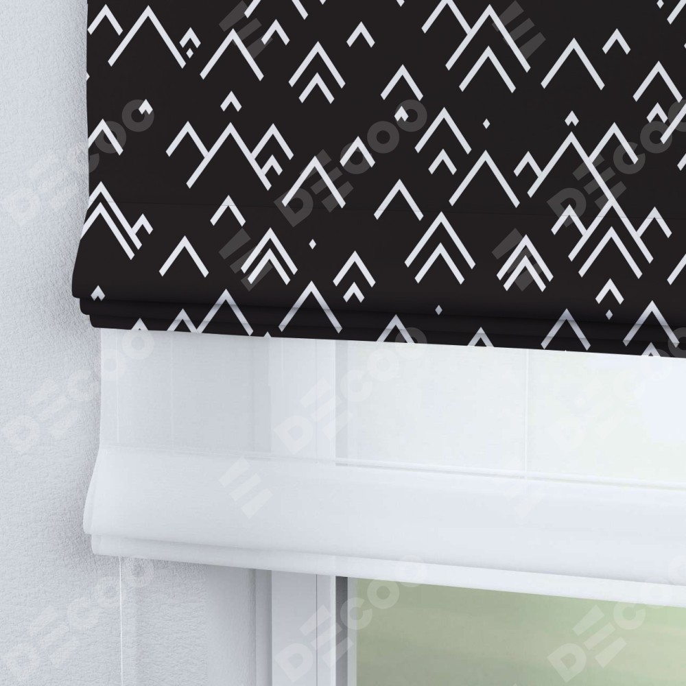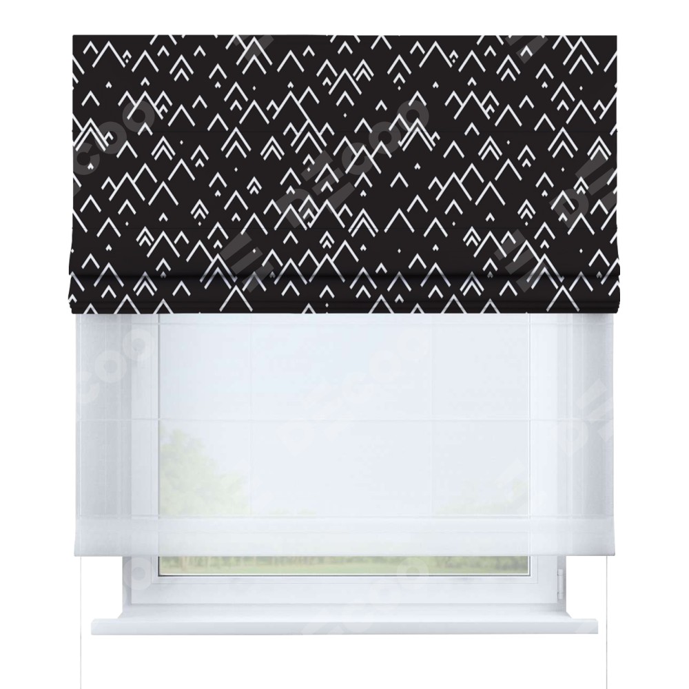 Римская штора день-ночь производителя «Cortin», используется для проёма, пошита из двух полотен, с лицевой блэкаут с нанесением сублимационной печати «Черно-белый минимализм», вторая ткань тюль (по стандарту комплектуется тюль белого цвета артикул V-01). Имеет универсальный механизм и подходит для монтажа: на потолок, на стену и в нишу.